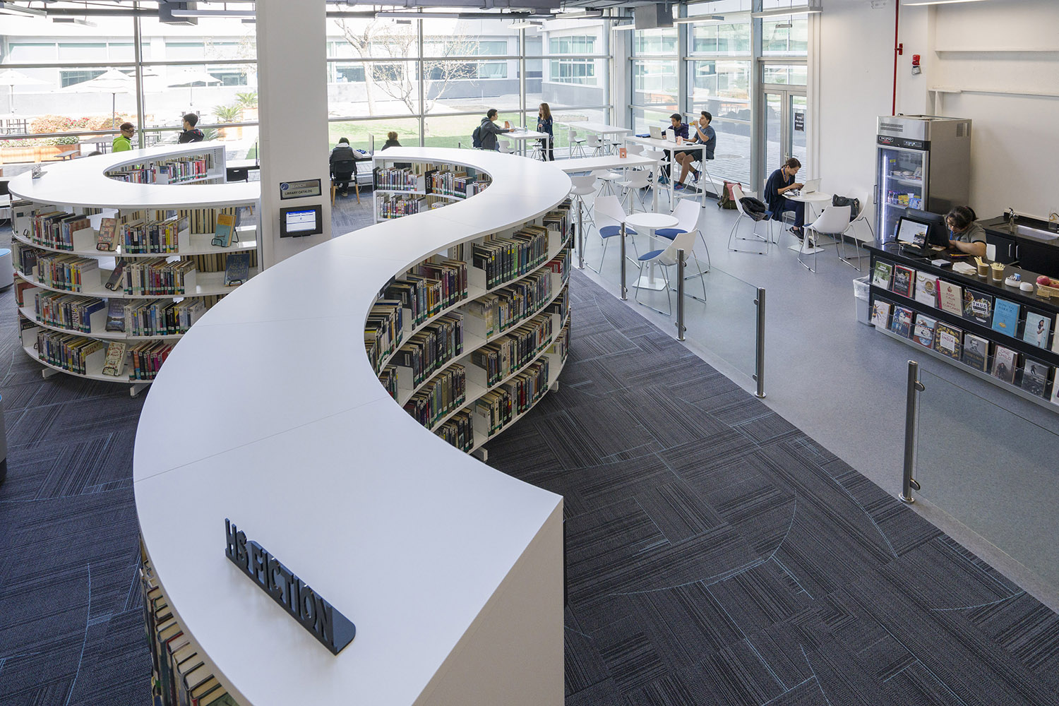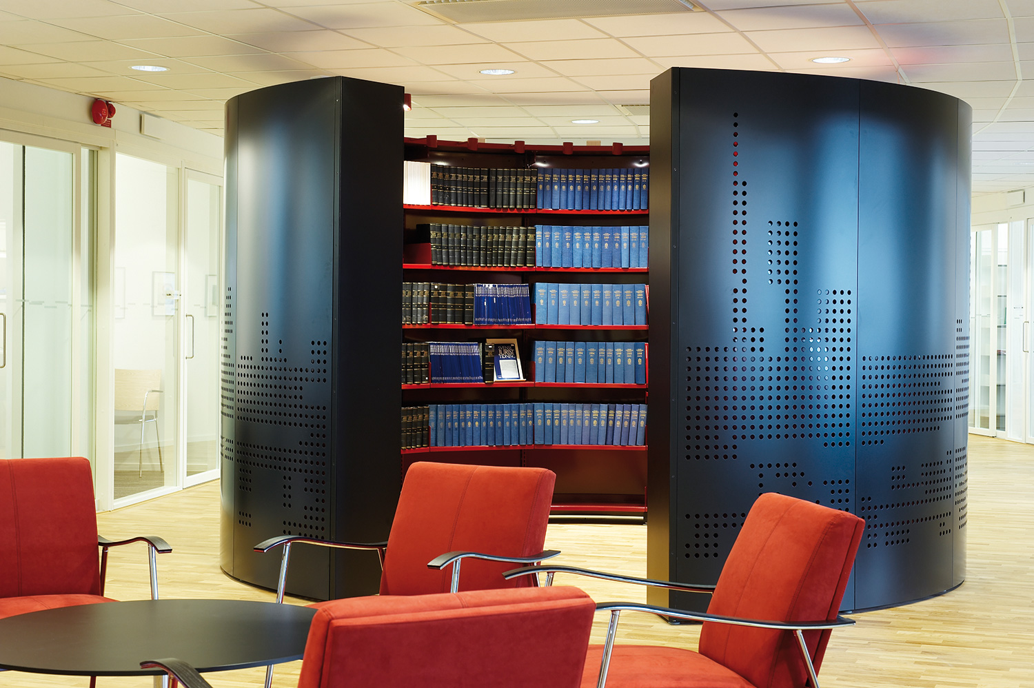 We offer special solutions to fit your library, e.g. a single-sided round shelving system combined with seating. See photos for inspiration and technical specifications under Downloads for more details.