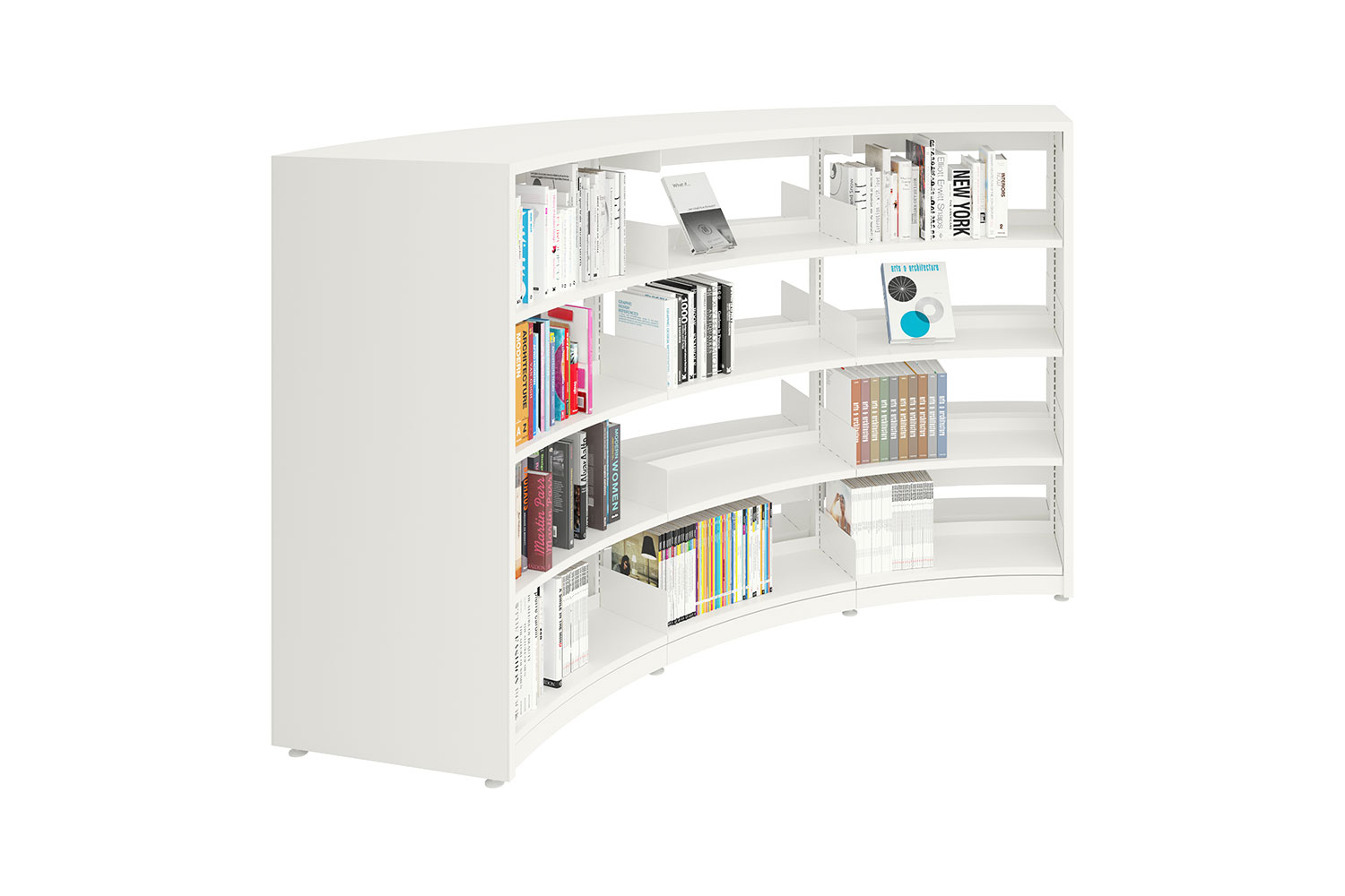 Use it as complete round shelving or use a number of bays for a curved expression. Create private spaces for children or quiet reading areas. Enhance specific topics or simply add the round shelving to diversify a simple, straight interior design.