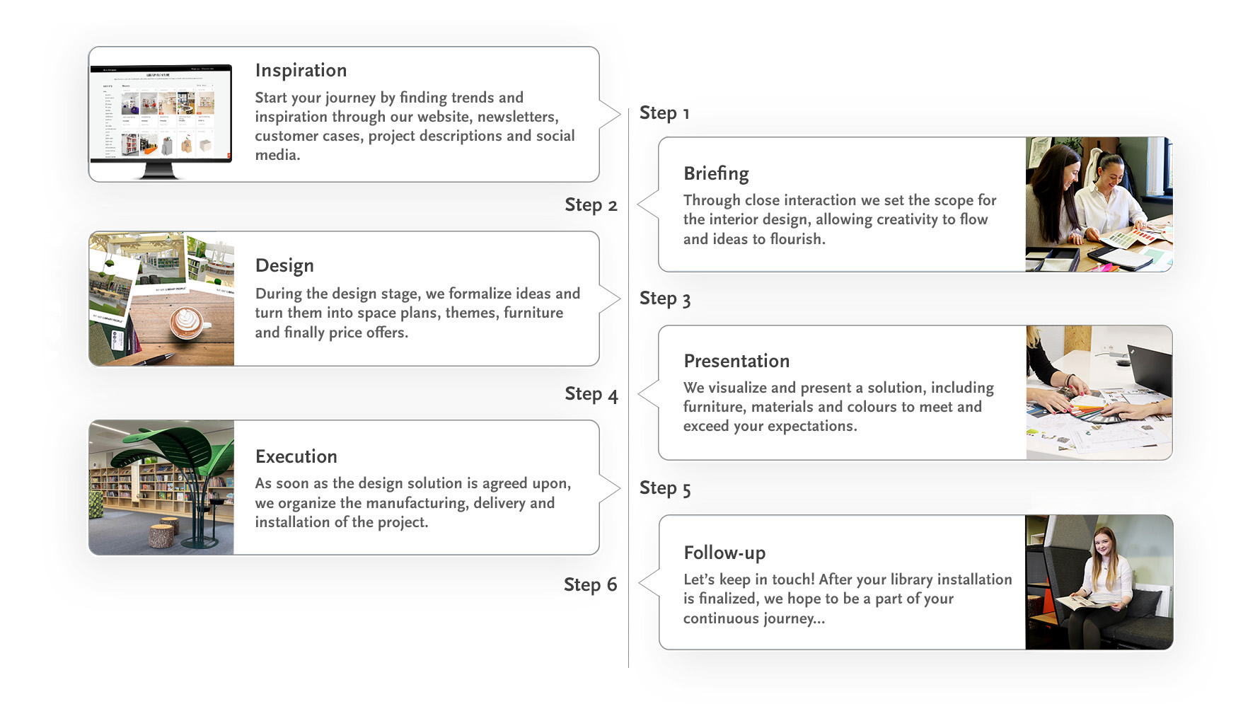 Our aim is to be a close partner and a source of inspiration throughout the journey towards a brand new or refurbished library.