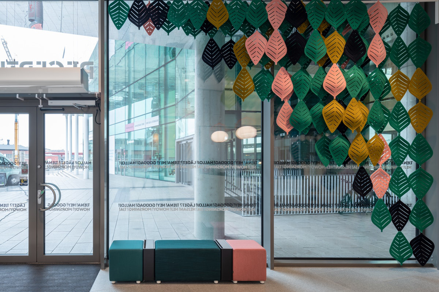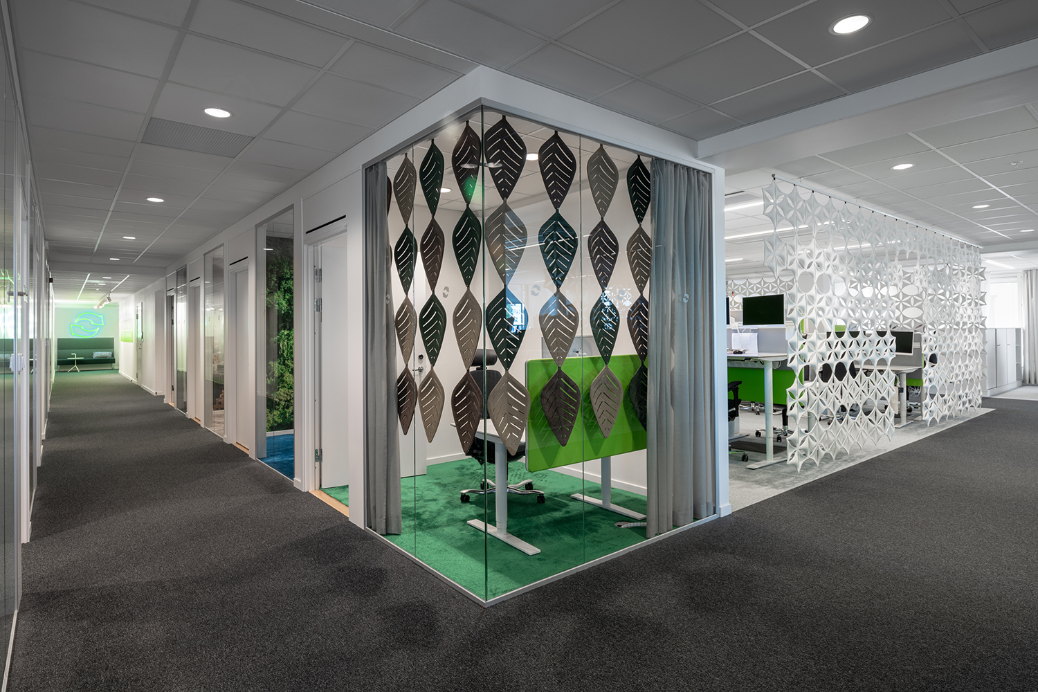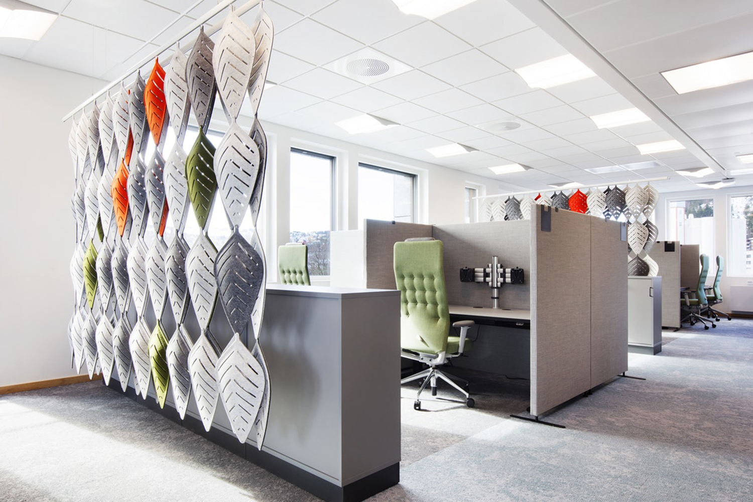 Airleaf makes it possible to create separate areas and a pleasant soundscape while preserving the room’s openness. You determine the degree of openness yourself by choosing how the leaf-shaped modules are combined. The leaf-shaped modules can be combined into sound-diffusing screens in a variety of patterns and formats.
