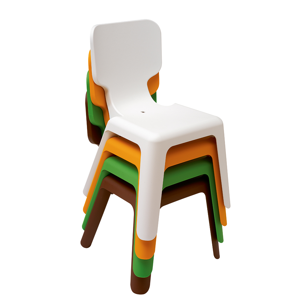 A light, stackable children’s chair with a unique seatback. The back is decorated with branches, leaves and even little birds here and there.