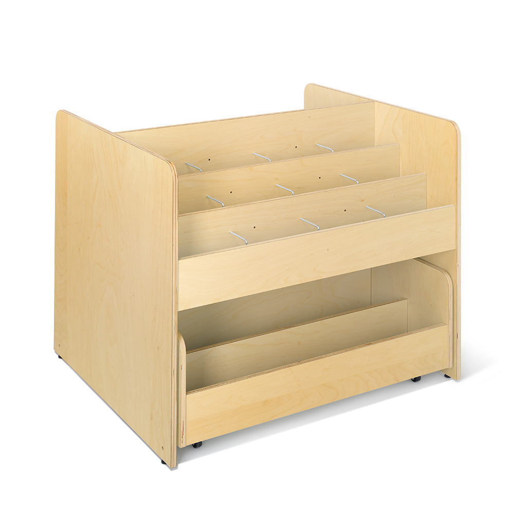 Popular, double-sided 3 tiered browser with 2 adjustable dividers and storage drawers with 2 compartments and castors underneath on both sides.