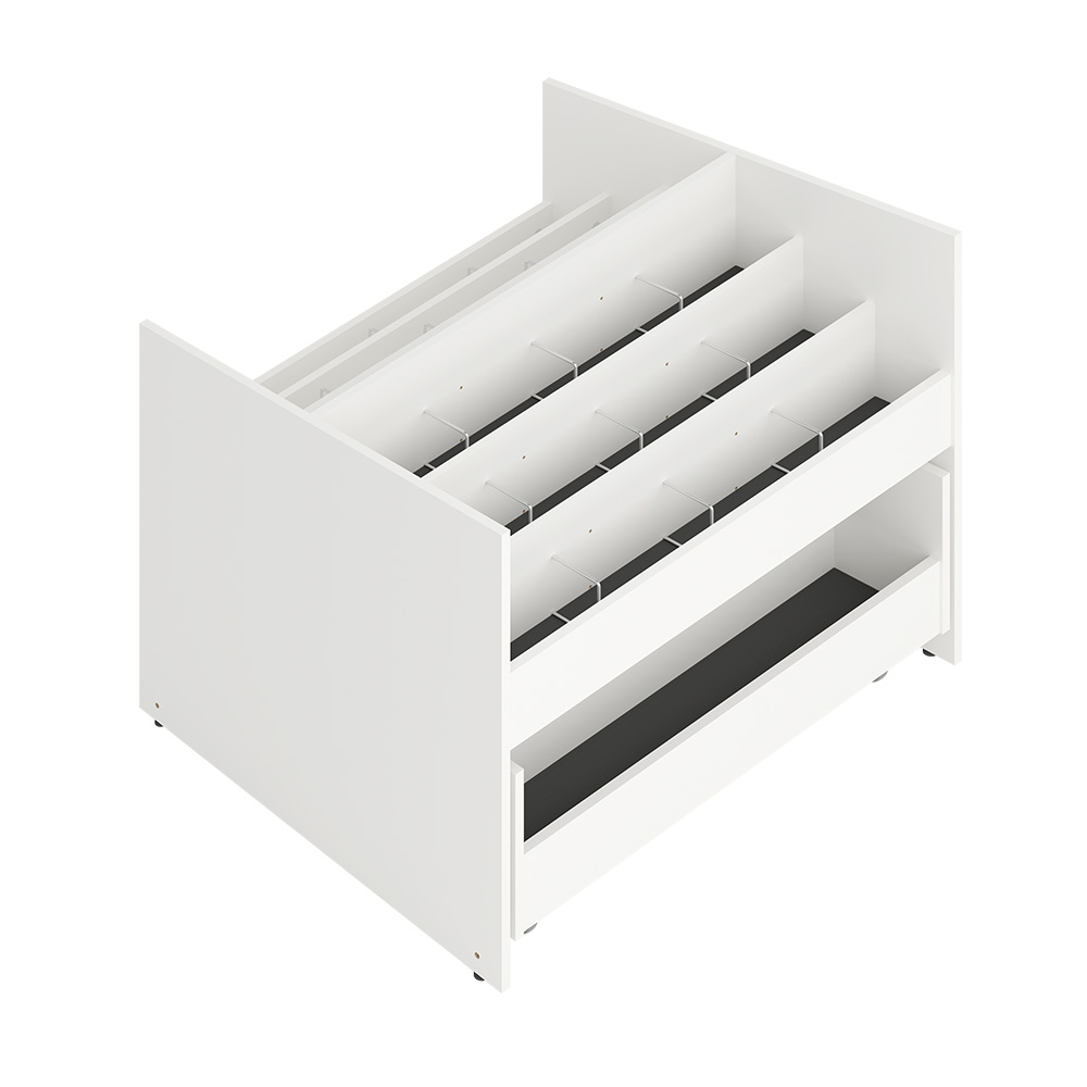 Popular, double-sided 3 tiered browser with 2 adjustable dividers and storage drawers with 2 compartments and castors underneath on both sides.