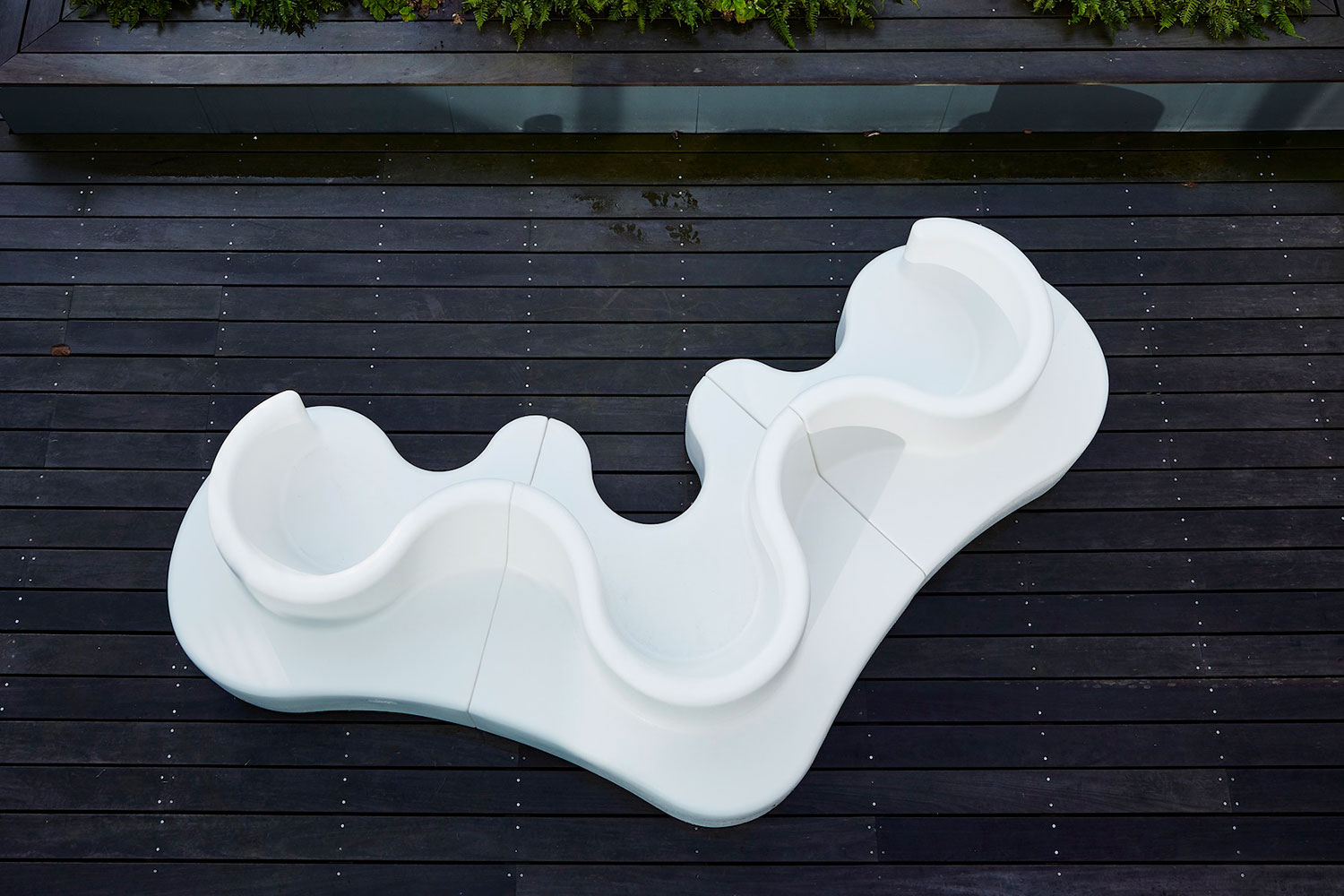 The sofa is a multidirectional, modular sofa made for both in- and outdoor use. The backrest in the middle of each module can either provide privacy or open up to conversation.