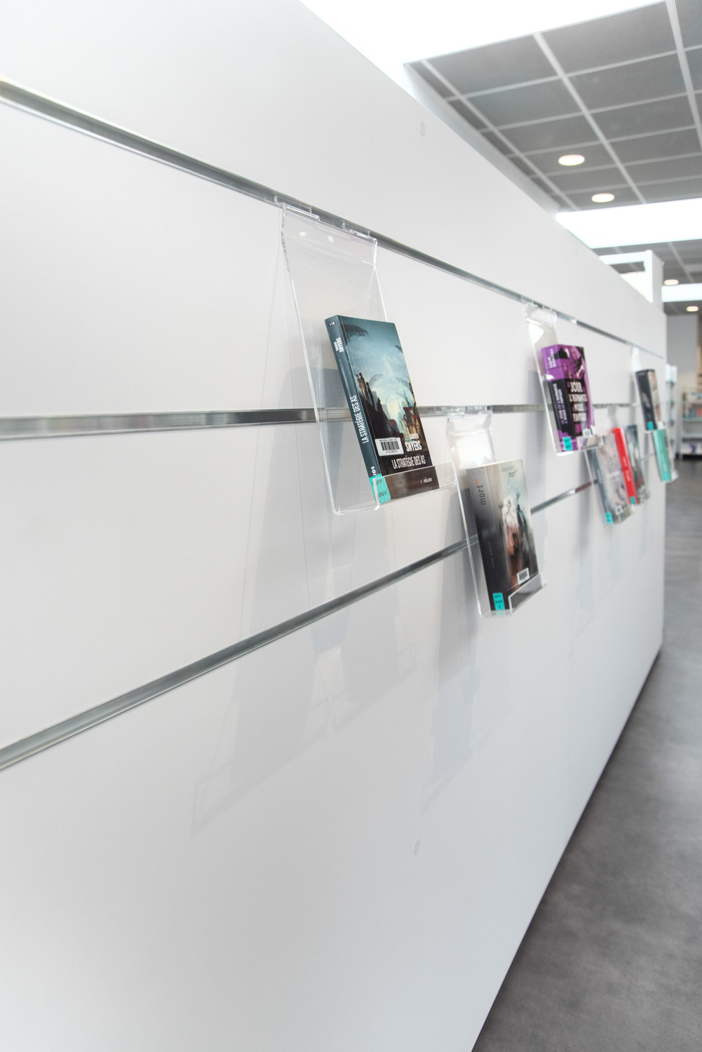 A collection of acrylic holders suitable for slat display panels and Quattro book tower.