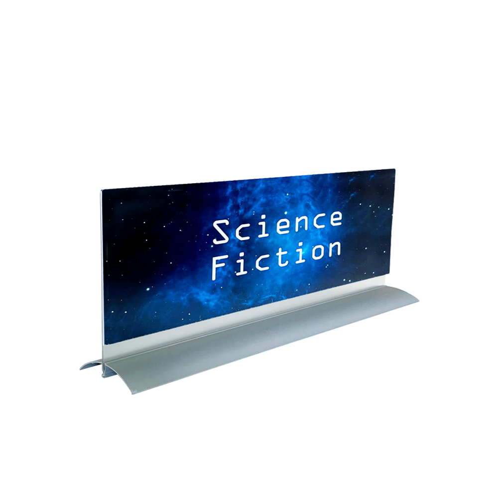 Exclusive double-sided sign for tables, countertops, shelves, window displays, etc.