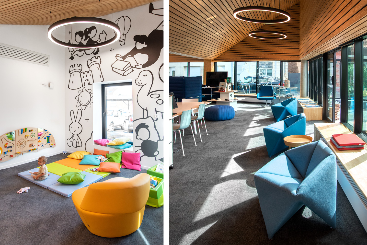 Fold is constructed of various geometric shapes and creates a fun contrast to the rest of the library interior design.