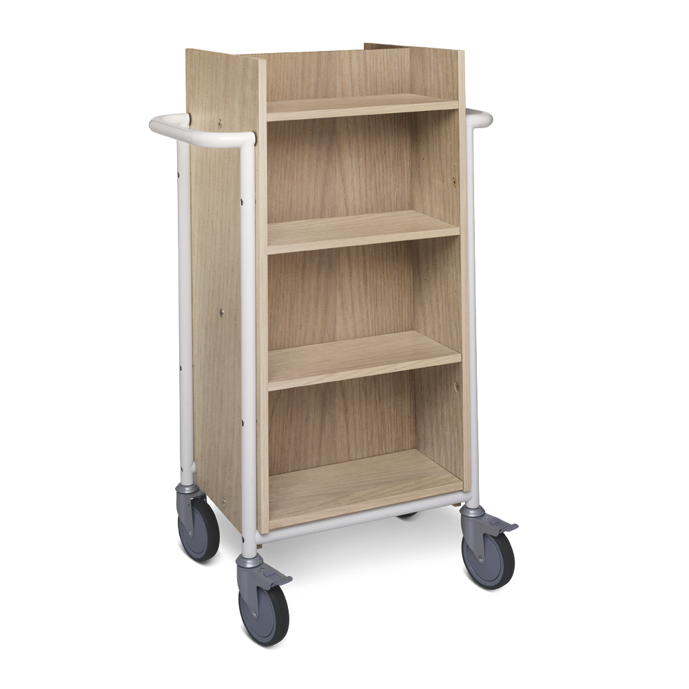 Functional, double-sided book trolley with 8 shelves. 6 shelves are adjustable to accommodate various media sizes.