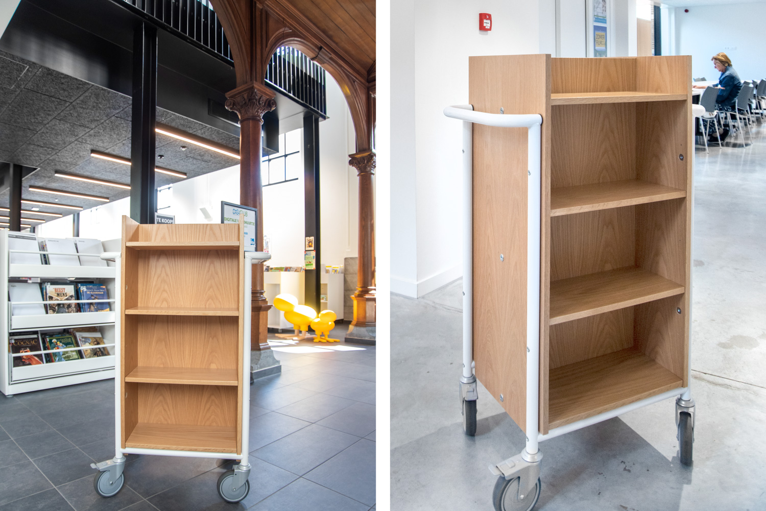This book trolley can be used as a mini shelving system that can be moved around in the library where needed.