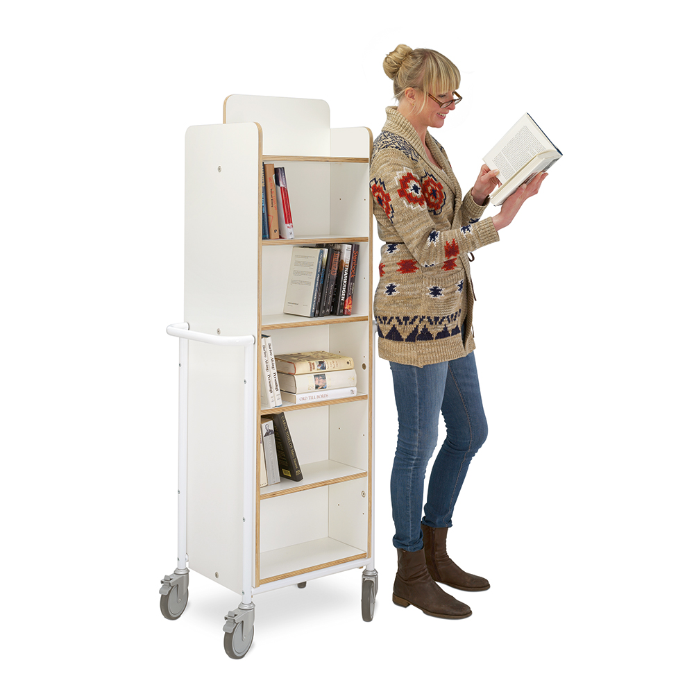 Large, double-sided book trolley with 12 shelves. 10 shelves are adjustable to accommodate various media sizes.