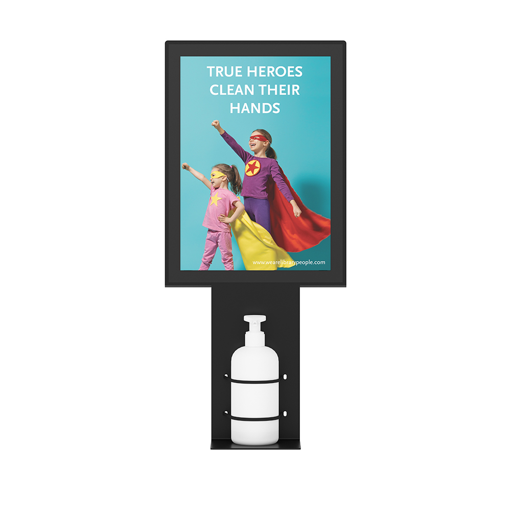 Wall hung stand for hand disinfection with A4 magnetic frame for easily change of information.