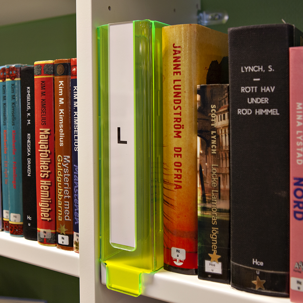 On-shelf guider manufactured in a high quality glass look or fluorescent neon acrylic.