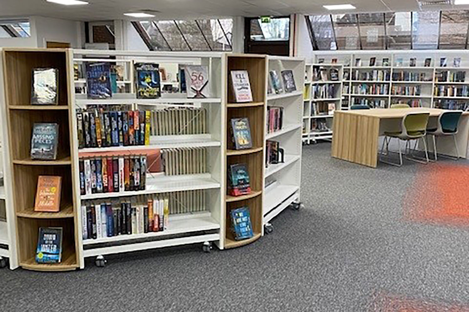 - Island shelving introduced to the design utilising the modern Lingo system, supplied with lockable castors to facilitate safe space reconfiguration by library staff.