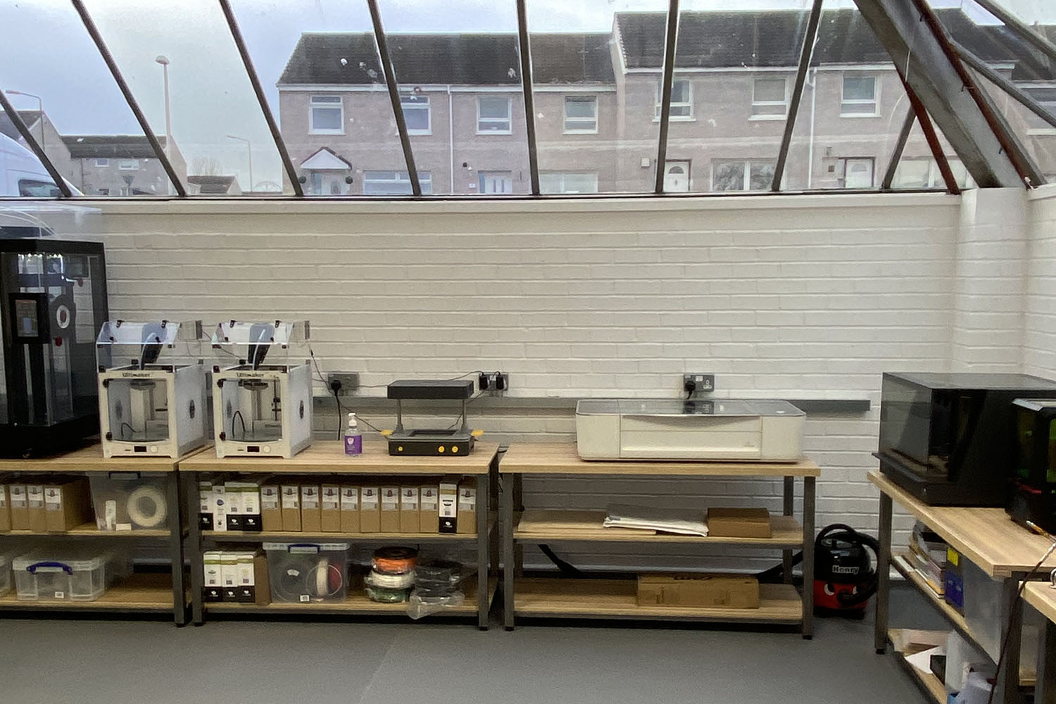 (a) a design space, promoting a relaxed and comfortable environment for users to develop their ideas. It includes, among other features, workstations with welded frames (providing extra durability) and bespoke storage boxes, allowing long-term projects to take place whilst preventing clutter.