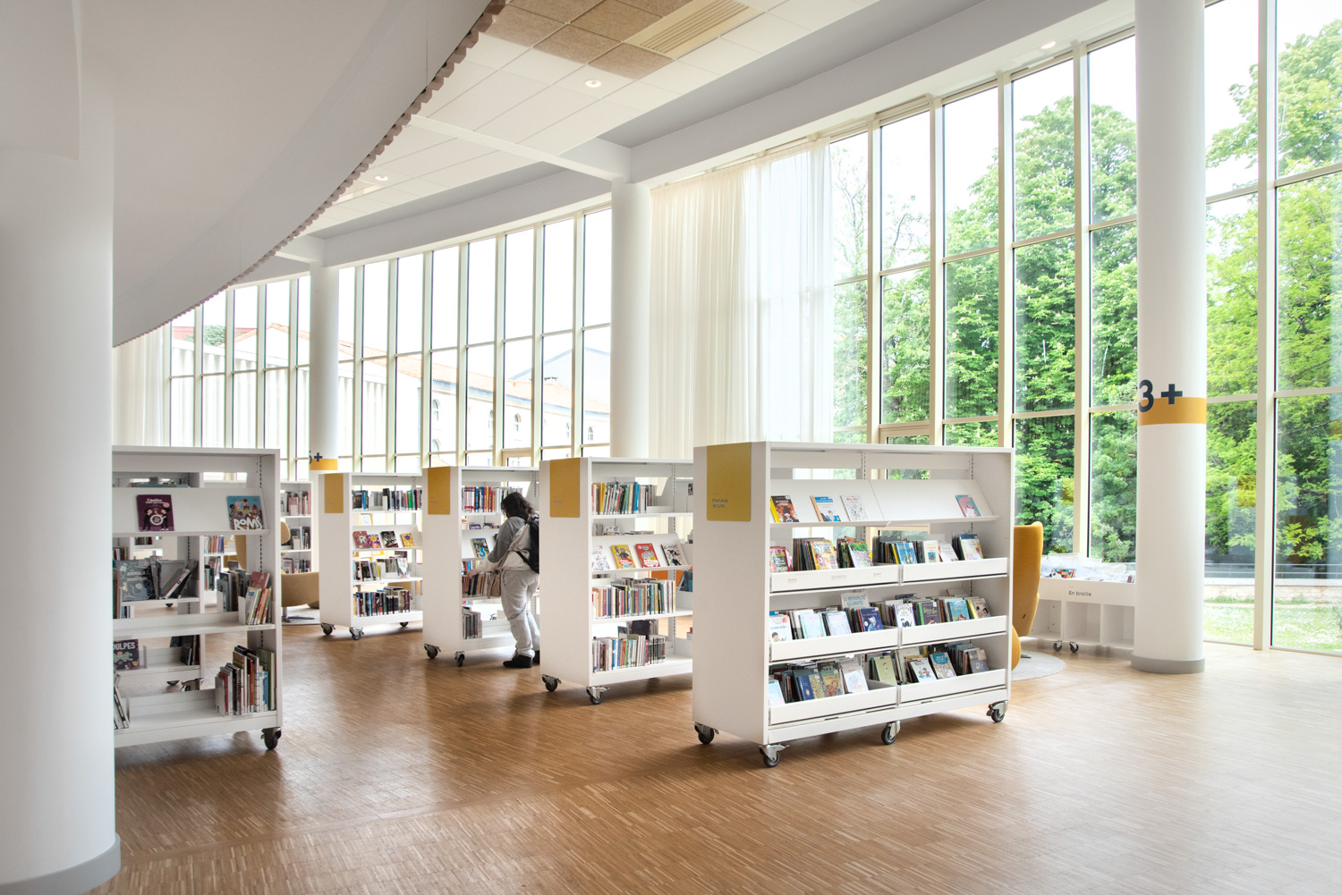 The library forms a living and active space that blurs out the lines between the urban space and surrounding nature. The visitors have diverse possibilities to experience, discover and play in bright areas that are not too crowded creating a sense of being out in the open.