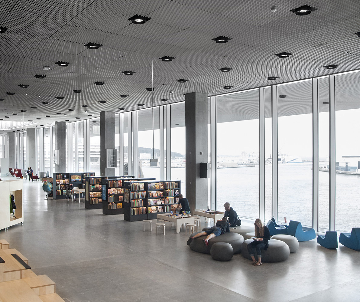 Dokk1 Library in Aarhus, Denmark has big, open facades with lots of natural light coming in. The 360-degree panorama view creates a conscious connection between outside and inside with views of the stream, the ocean and the new docks.