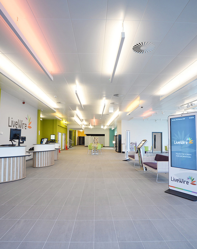 Great Sankey Neighbourhood Hub is an integrated facility. The building includes health, leisure and library facilities for the community. Thedesignconcept worked closely with everyone involved to produce designs that were kept close to the Architect’s original vision for the space. Due to the hub being one of the first public wellbeing buildings seeking Dementia Friendly accreditation, we researched the best practice for designing dementia friendly environments with the aim of getting accreditation from the Stirling Dementia Services Development Centre.