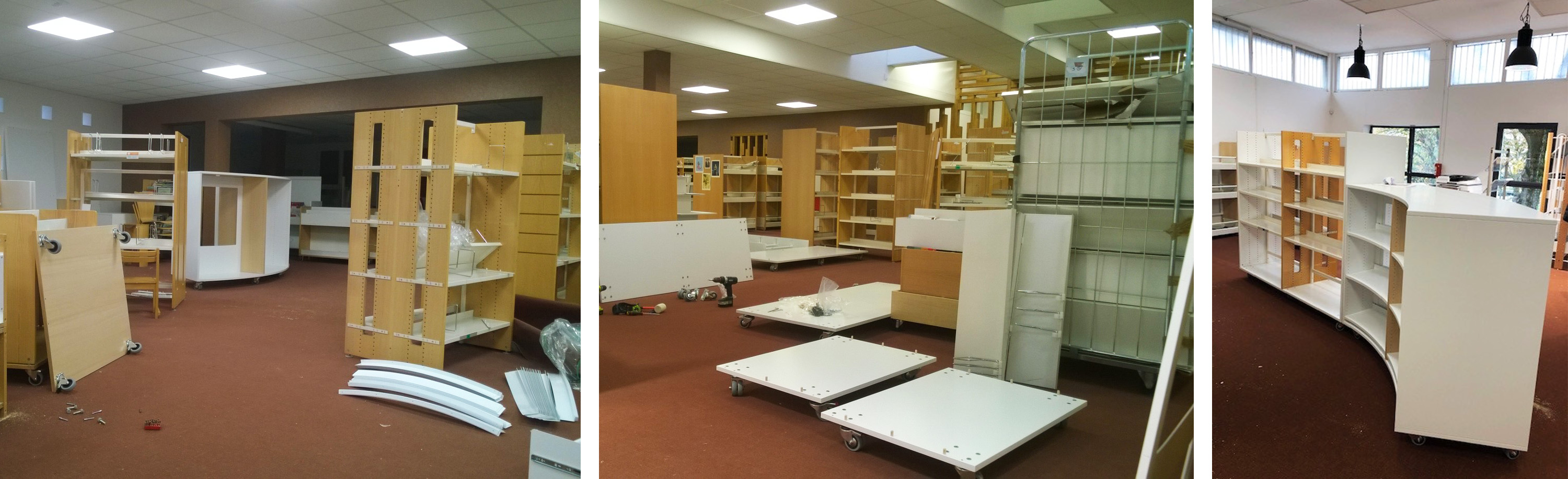 The following images demonstrate the major changes, and the considered upcycling and re-assignment of shelving and furniture at Verrières-le-Buisson.