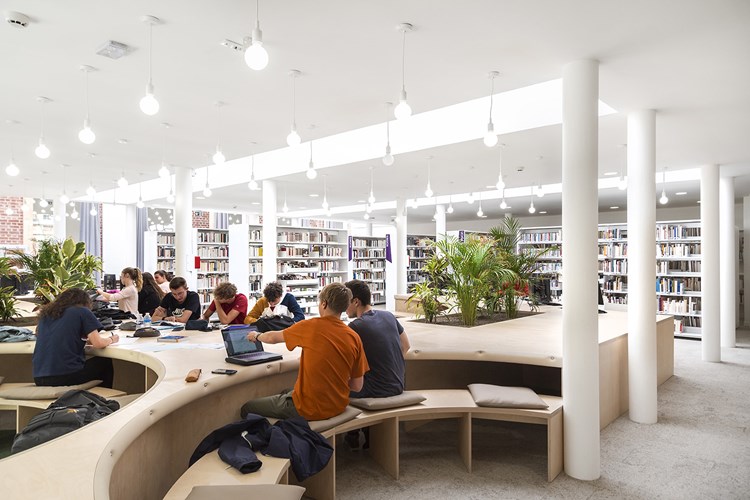 Frontline shelving system – now replaced by Lingo – with built-in seating