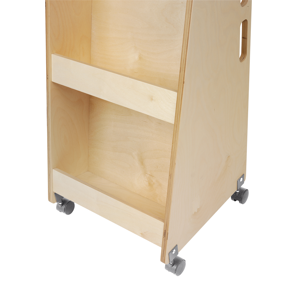 Compact book trolley made of birch plywood with 2 fixed shelves with front edge for front display of picture books, for example.