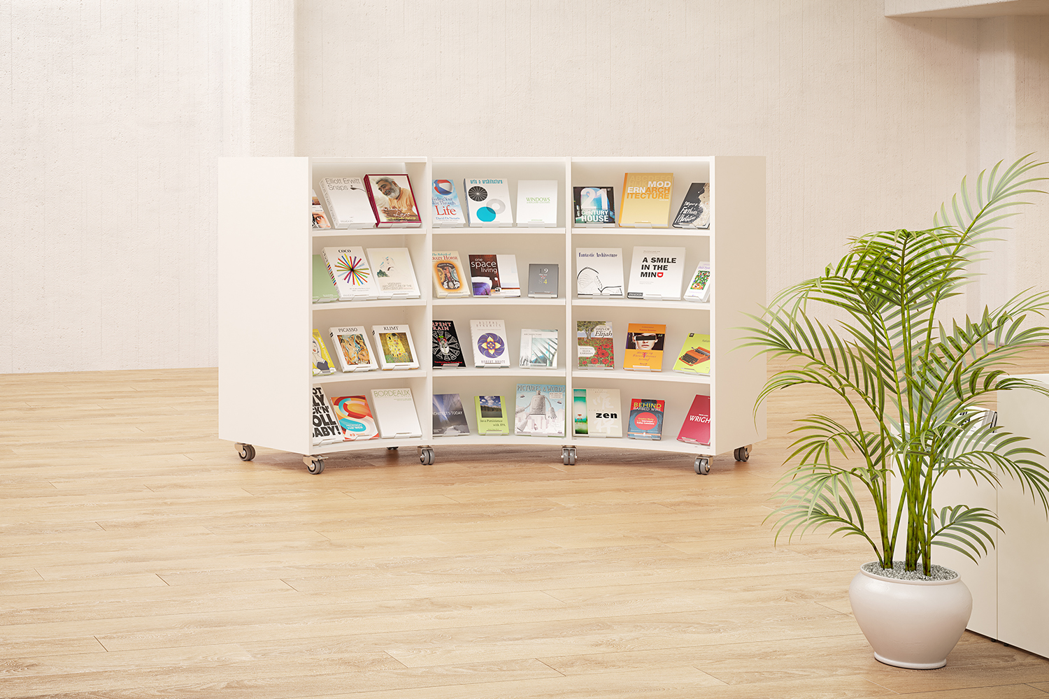 The Lingo round shelving is an ideal solution for both storing and displaying books as well as creating zones in the library. Create small reading or specialized zones by making almost complete circles, where library readers can hide away, or create open waves running through the library.