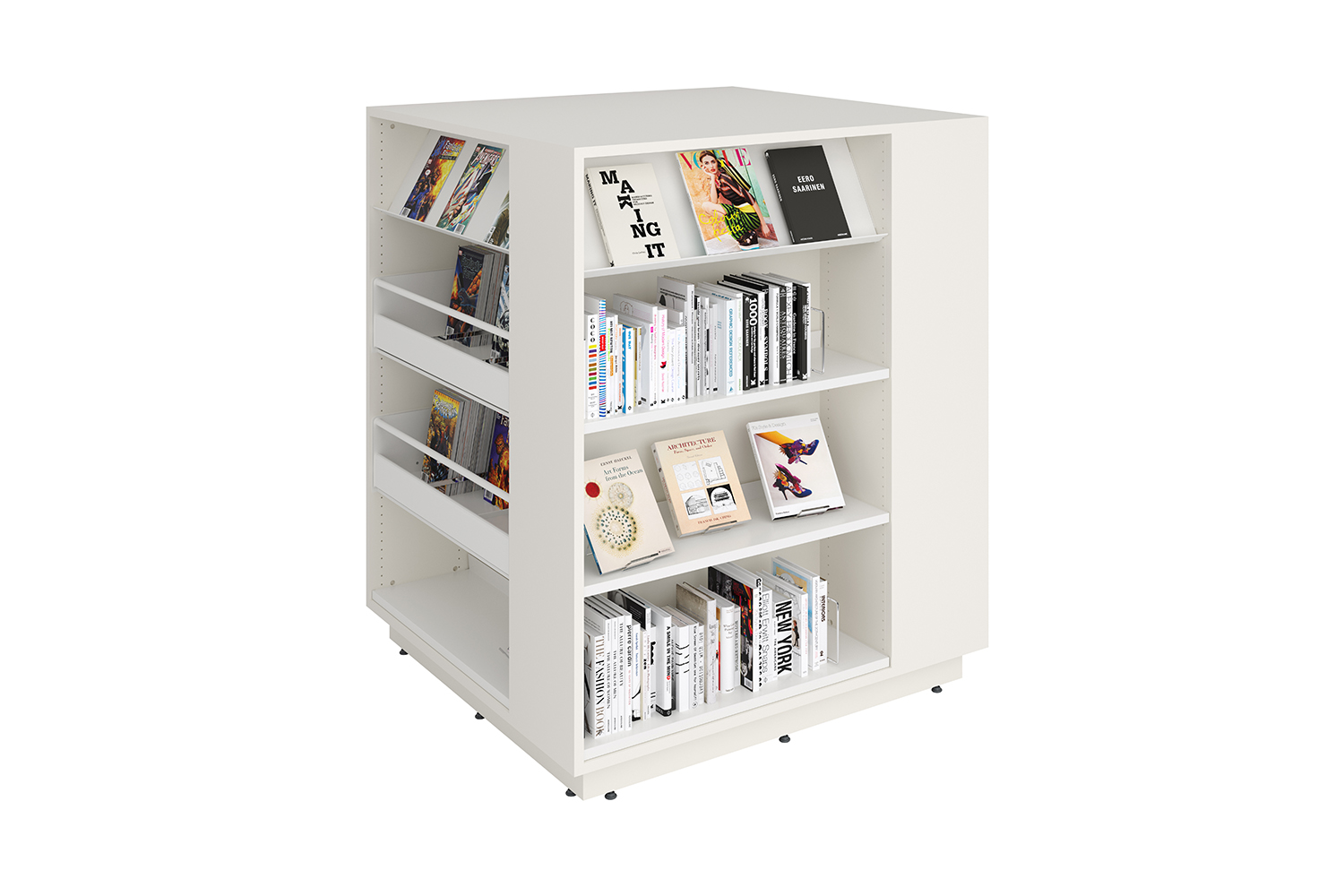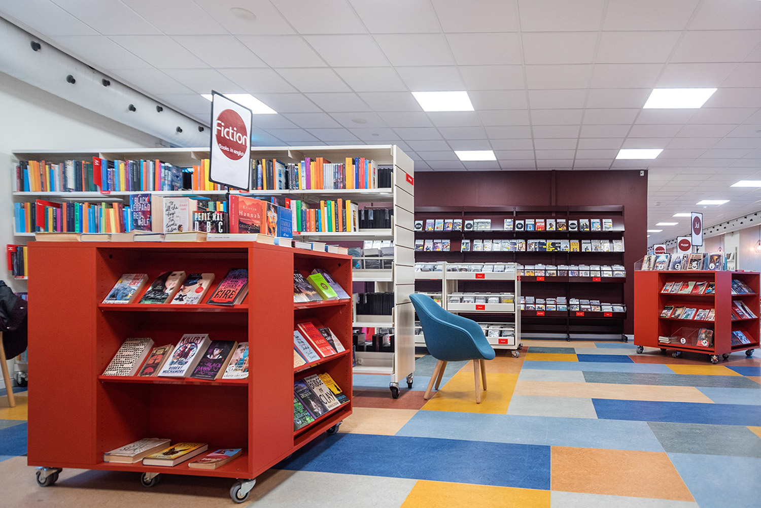 This quadratic shelving system can be used for both display and storage. Use flat shelves or browsers for maximum storage of large volumes of books. Or use a wide variety of functions to create display areas. The top of Lingo Square allows for several usage options - e.g. as a work table or a play area. Or why not use it as a surface to create book themes to visually catch the attention of visitors!