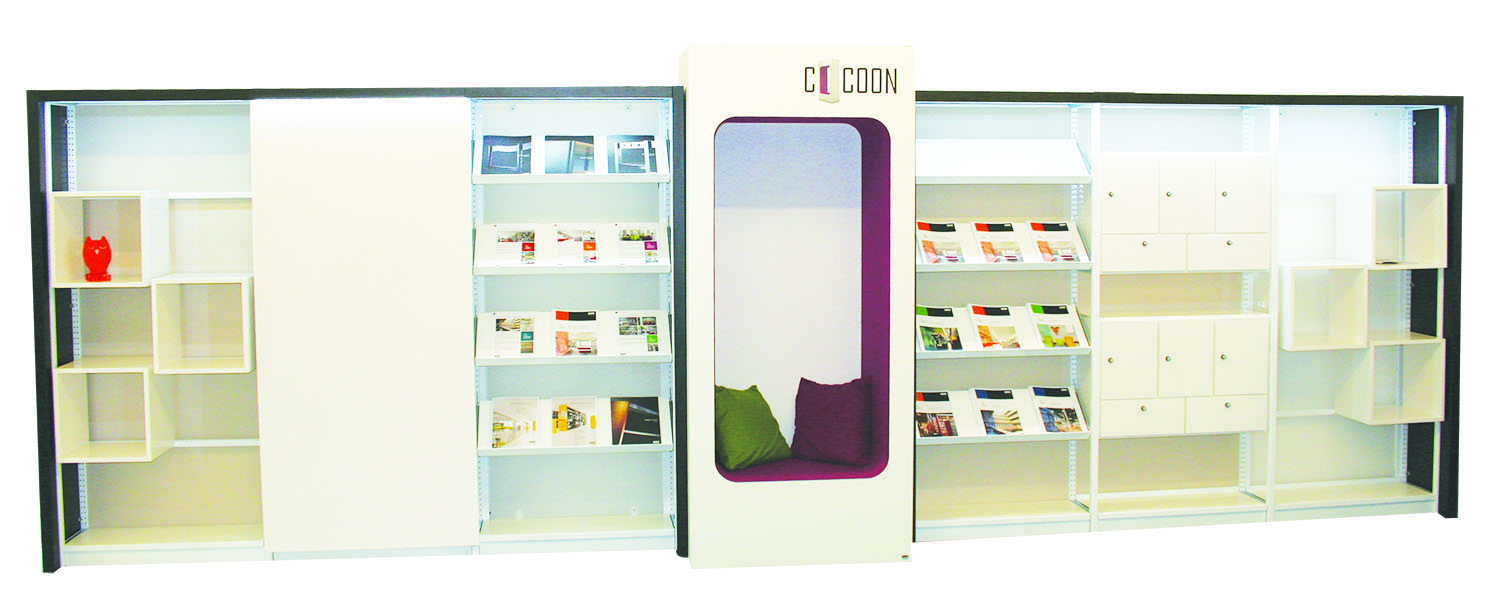 Experience your shelving system with a vertical positioned Cocoon. Listen and relax to your favorite music using the integrated Bluetooth technology. Use the Cocoon seating, table and browser to create a living room feeling in your library.