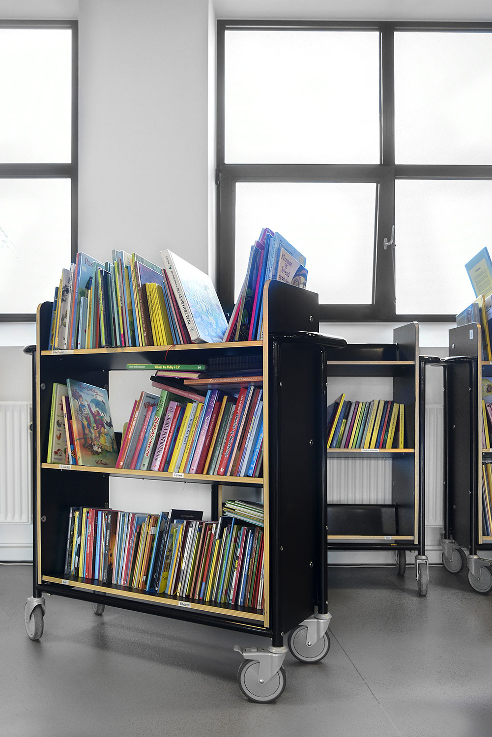 This book trolley can be used as a mini shelving system that can be moved around in the library where needed.