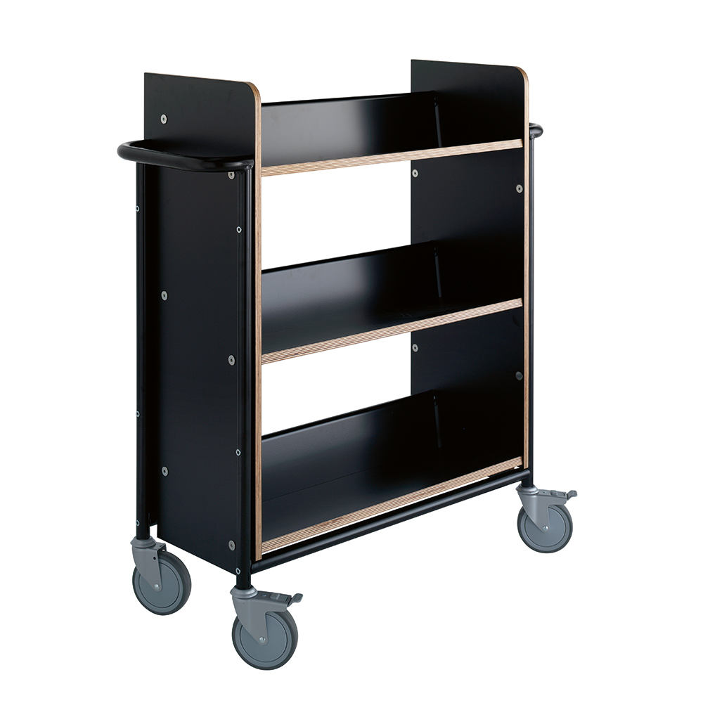 Functional, single-sided trolley with 3 fixed reverse tilted shelves which ensures safe media storage.