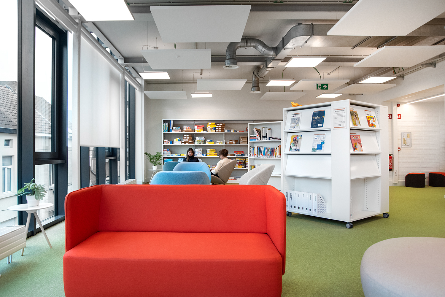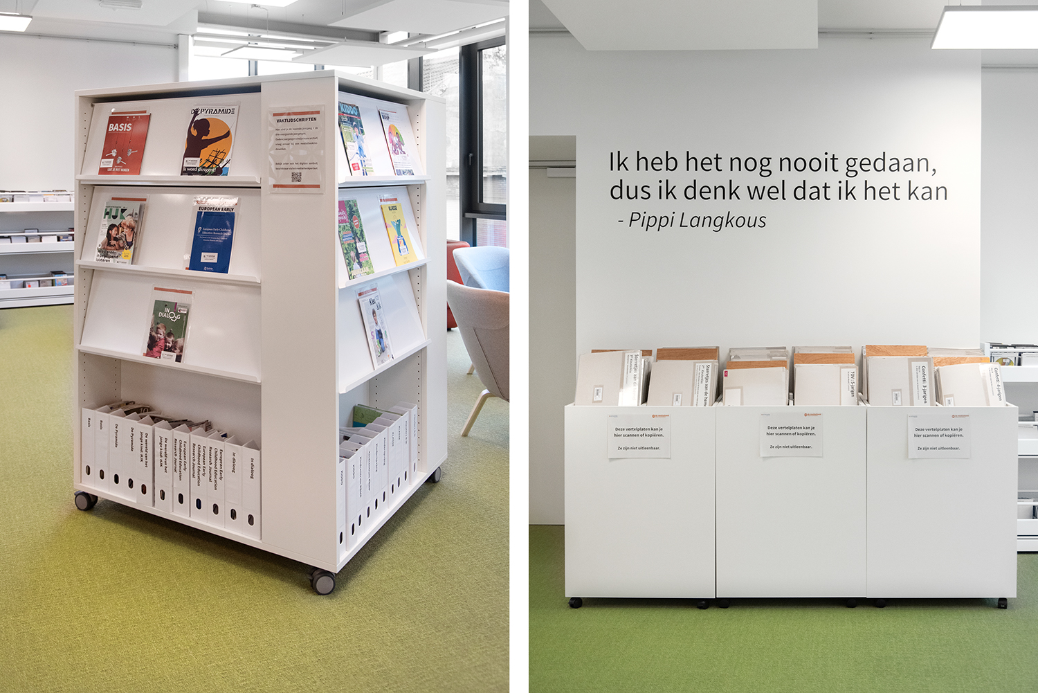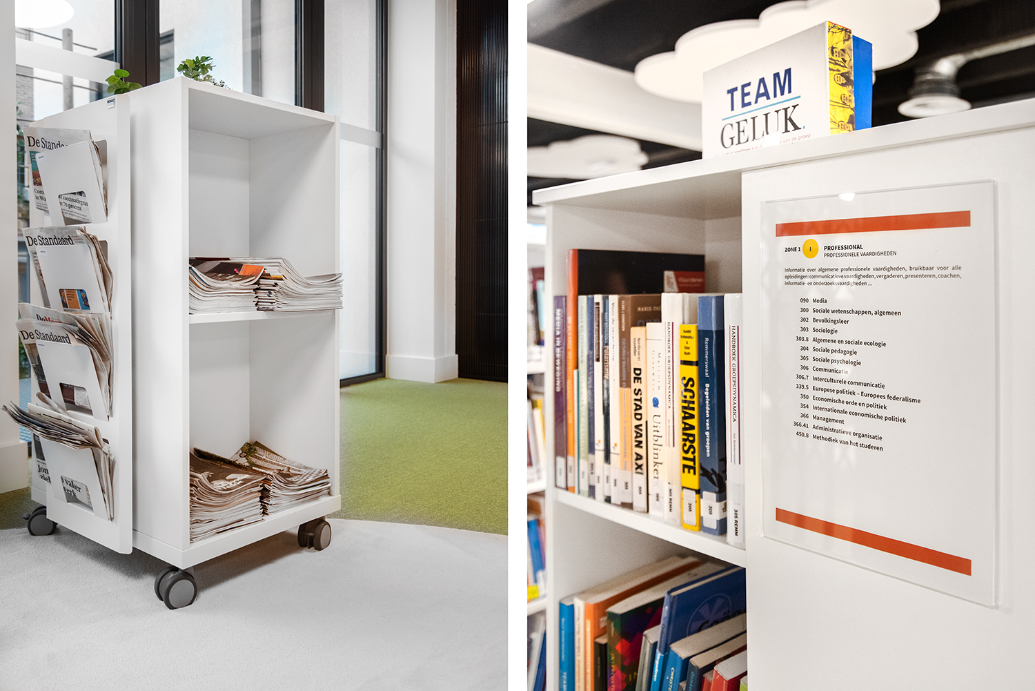 The library has become a place for visitors to work, relax and meet. Employee Lore Letermere says: “Students, employees, and visitors unanimously agree that the renovated media library has become a pleasant and inspiring room. People are very positive about the quiet, sober environment that also radiates warmth and is comfortably furnished. The media library looks light, fresh, and a bit playful. Completely tailored to the Preschool and Early Childhood Education for whom the media library is mainly intended.”
