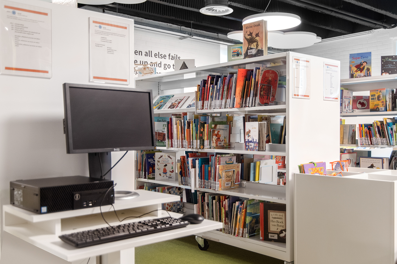 The library exists of three different zones each with their own look and feel: an open workspace, a collection area for paper books, and a DIY zone.