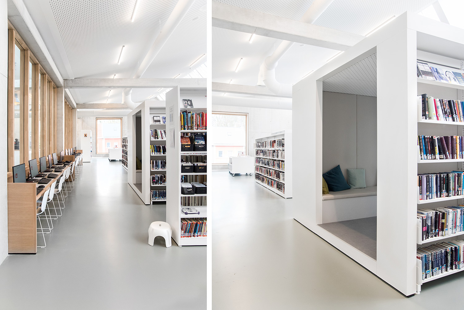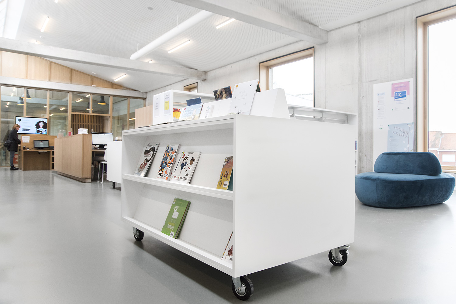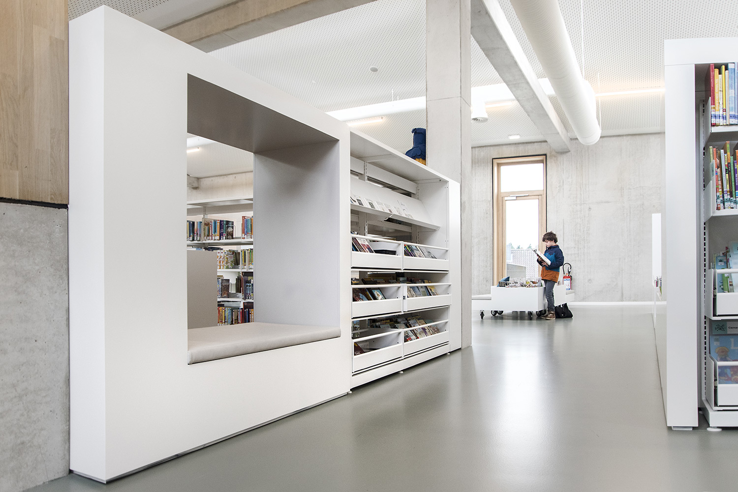 The design enables the library to fulfill its functions of reading, learning, meeting, borrowing and creation. There is pleasant seating furniture, a studio to study, a box to chat in, adjusted children's furniture, a self-loan tailored to the visitors, a service point where you can go with your questions, etc. Definitely worth a visit.