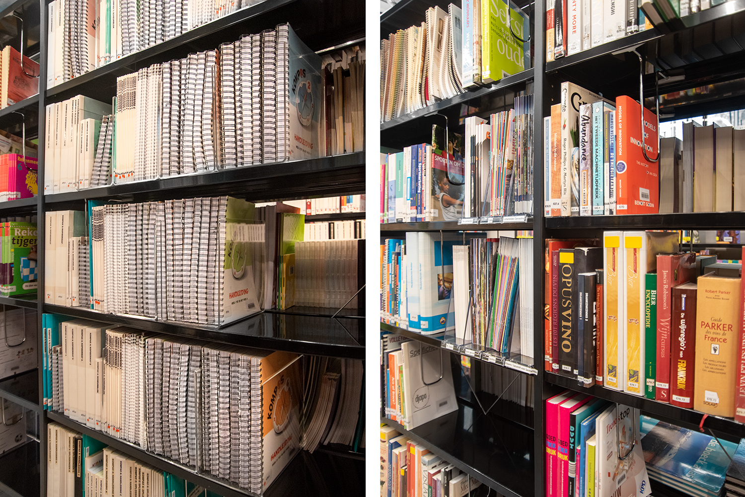 In a trendy and lively neighbourhood in Brussels, close to the canal, the Erasmus Hogeschool established its new campus Kanal. The transparent character is striking: a glass facade around the building involves student life in the neighborhood and vice versa. On the ground floor, the library is one of the eye-catchers in the interior. The black library shelving fits perfectly into the sleek, contemporary architecture of exposed concrete and wood and gives all the attention to the contents.