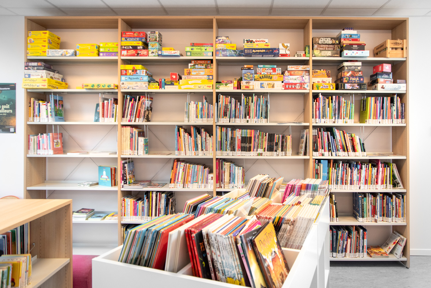 An opportunity to redesign the library to make it more pleasant and functional arose, when asbestos had to be removed from the building. There are now fewer shelving systems than before, which allows better circulation in the room. The library is divided into two different areas separated by an entrance hallway: a side for youth and a side for adults. The rooms are visually linked by the same use of colour and materials.