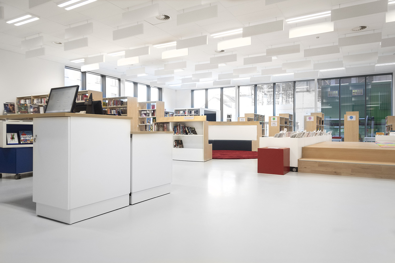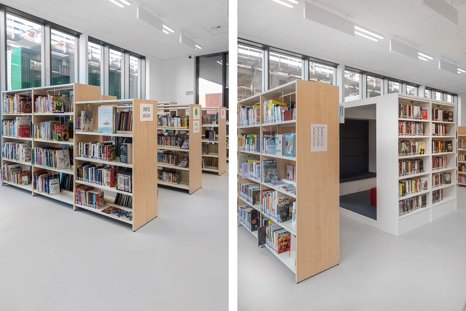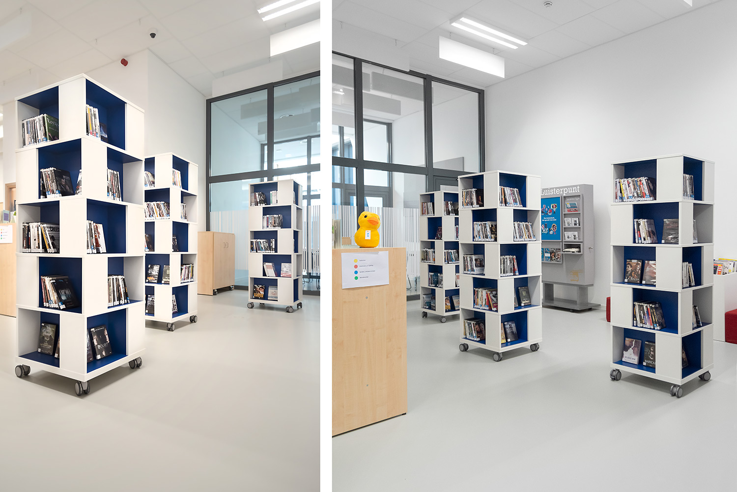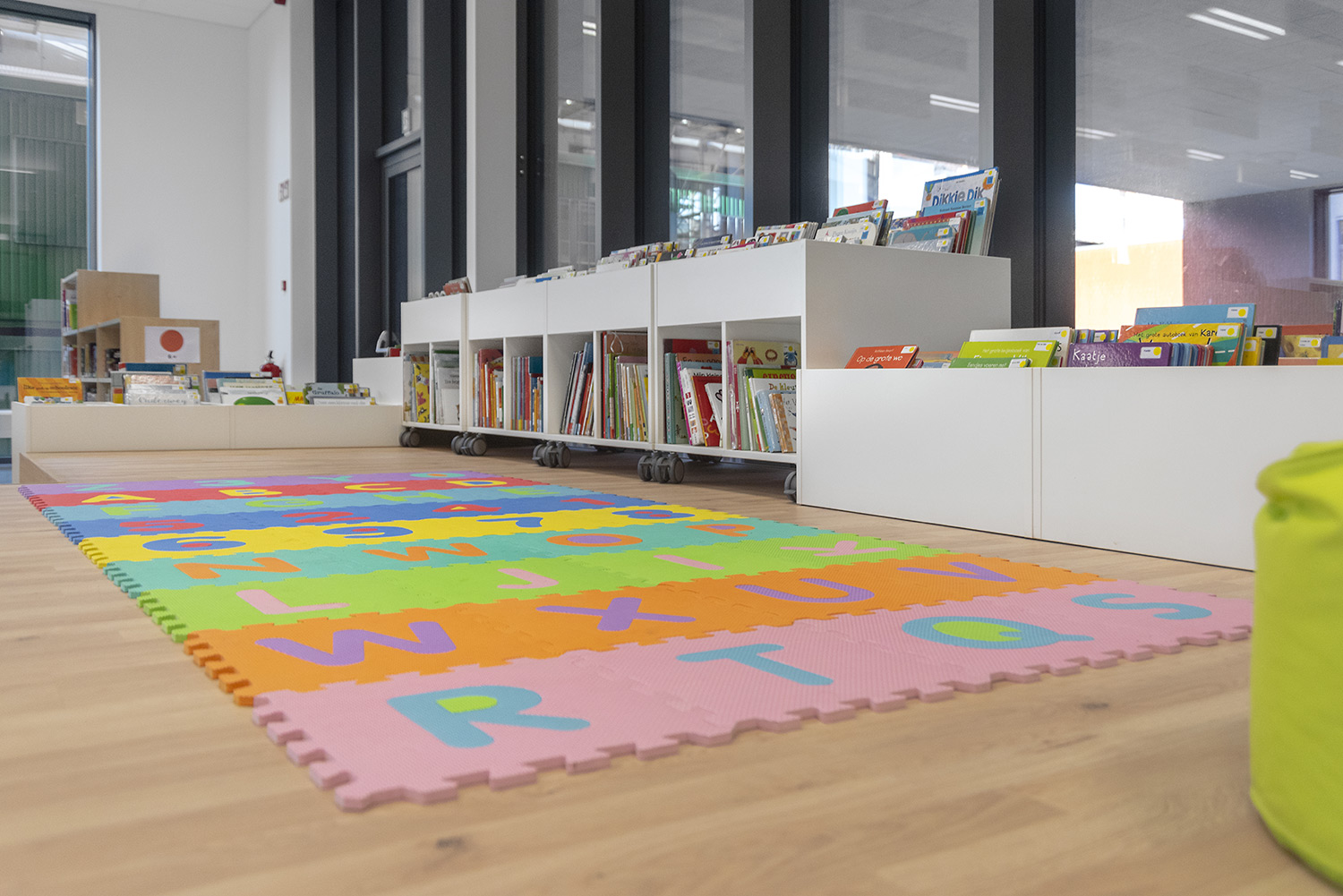 The goal with the new library in Koekelberg was to make it a beautiful and modern library. And so it is. The library is embedded in a larger complex with a sports hall and a multi-purpose hall, making new partnerships possible. The library becomes part of daily life, after school or sports you can easily visit the library. The interior is designed with focus on easy wayfinding, many seating areas and the possibility of privacy. Thoughts on the library journey have been included: where does the user enter the library and how is the user best guided on the onward journey? The user will go through the library in a natural flow; from baby corner to first readers to teenage area and to adult department. Along the way the user passes comics, DVD’s and reading areas.