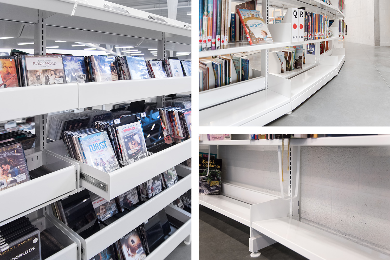 The 60/30 Shelving system follows the curved shape of the building so that the openness of the library is emphasized. The white shelving and the raw natural materials such as concrete and pine give the library a simplistic and sleek design.
