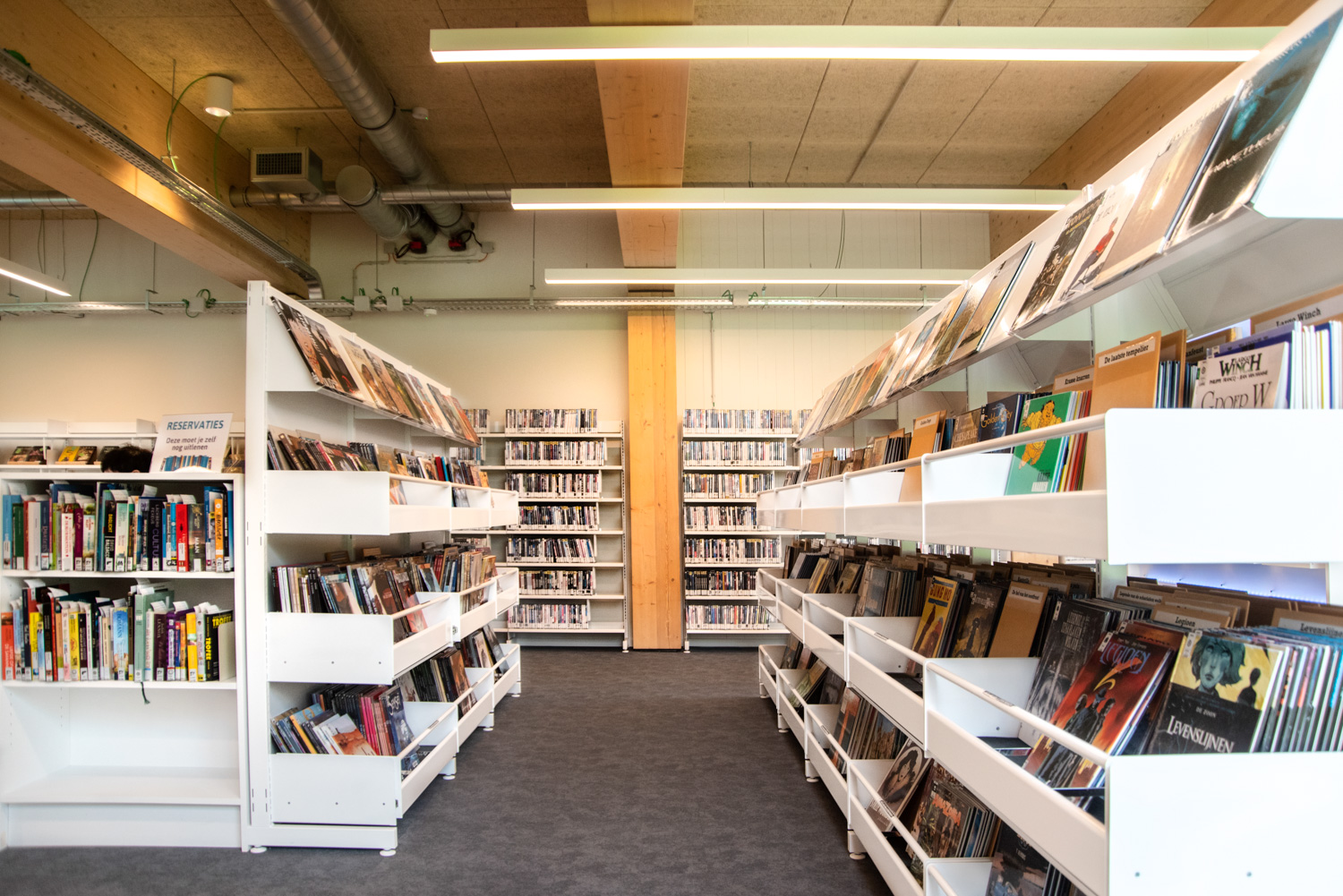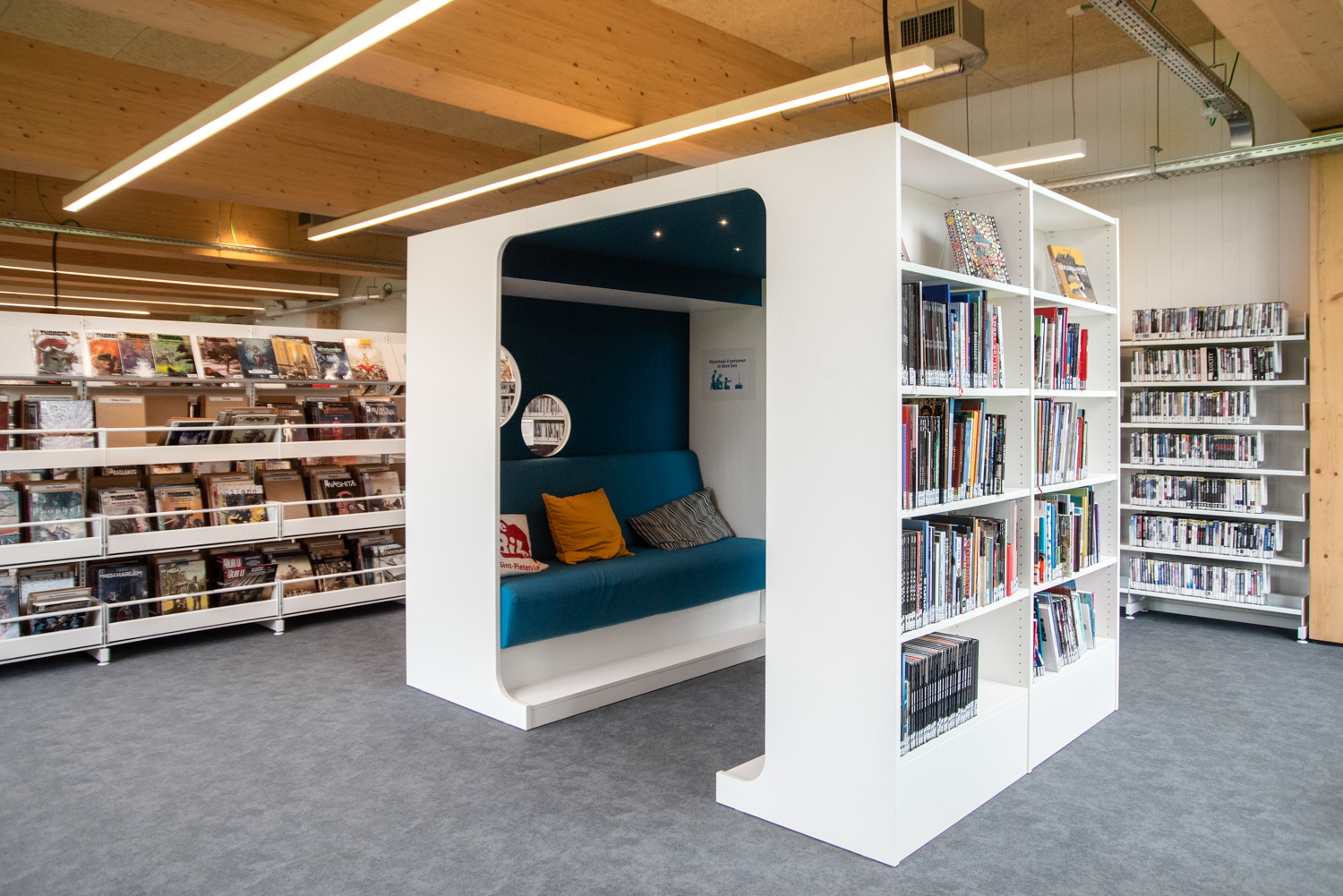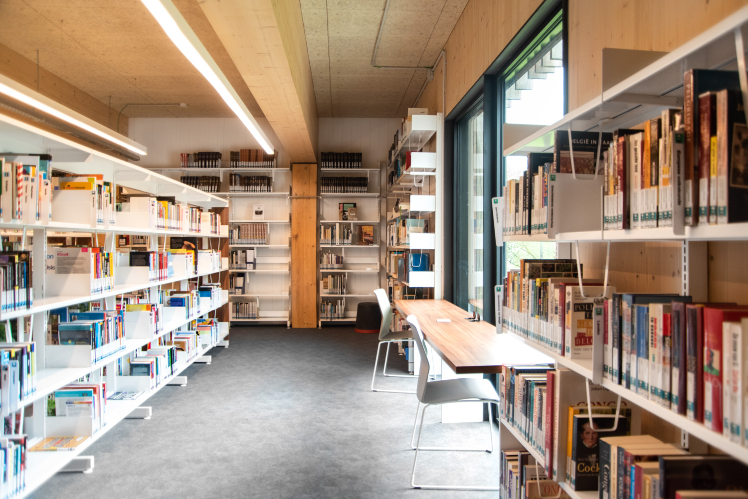 Located in the renovated De Viron country house, which also houses various leisure facilities, the library has become an attractive place with a distinct character. On the ground floor, there is an area with magazines, a reading corner and a toy selection. Next to the entrance, visitors will come across a fablab with a 3D printer. The youth section is located in the basement, and the "quiet zone” for adults is on the second floor.