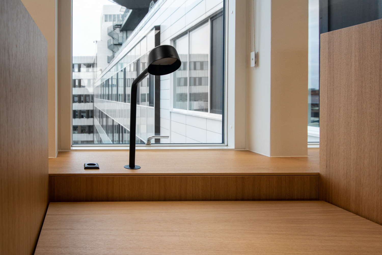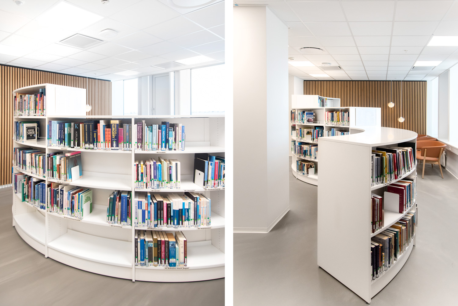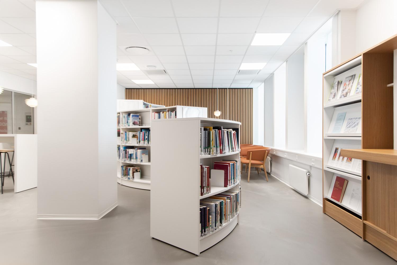 The wood provides a warm contrast to the glass and concrete building. Over the years, the wood will get some patina which will result in a “real” and unique expression. We have delivered the round shelving systems as well as the large oak study tables where the students can sit, either together or individually. All the wiring has been nicely hidden, tucked away inside the tables.