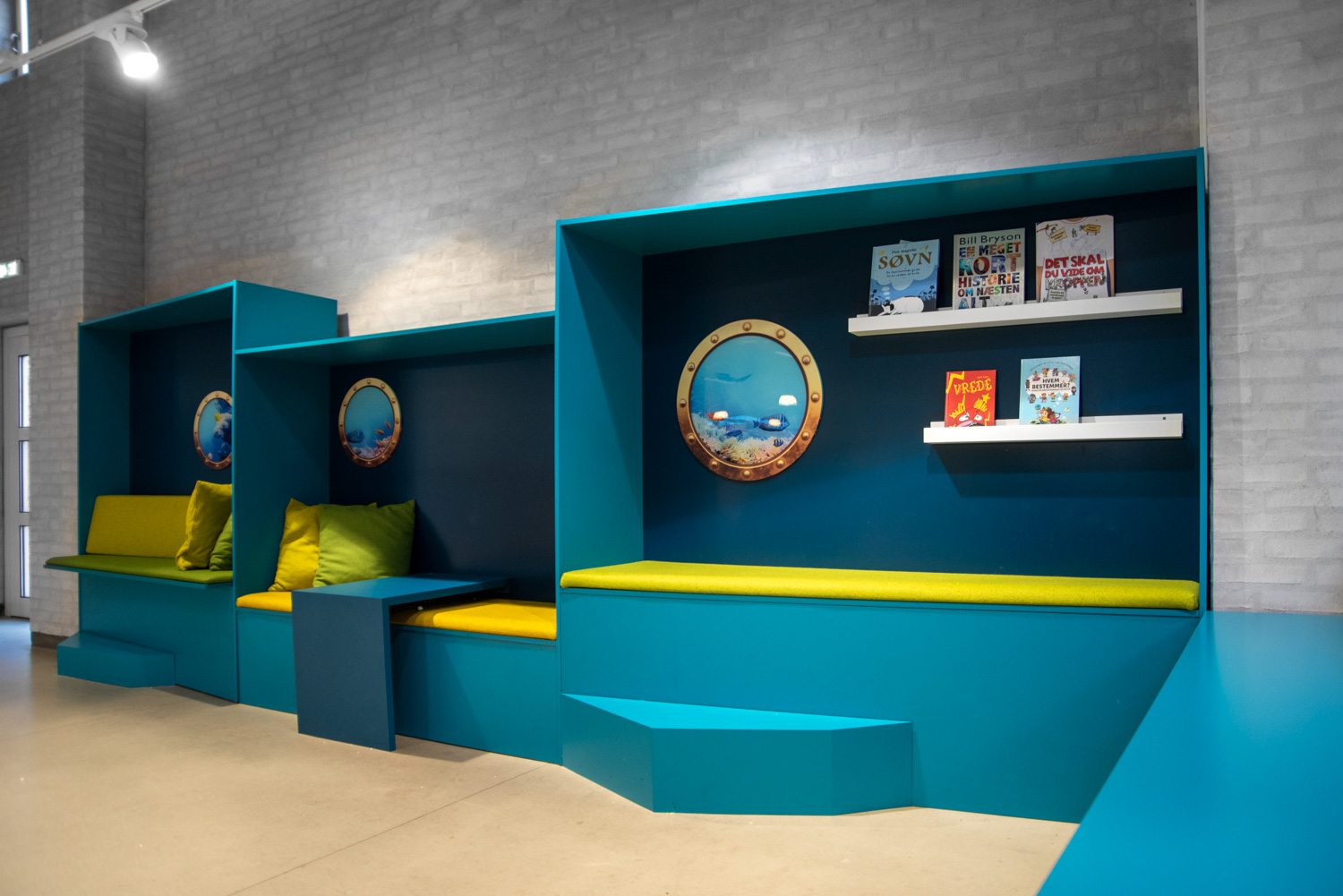 For the smaller children, the focus was to introduce a play area that also welcomed the parents. There is a tower called “Krudttårnet”, a miniature of the town trademark, which is a joy for children to climb and slide on. The turquoise reading caves have been provided with portholes that make it seem like you are under water. The parents or grandparents can take a seat at various lounge seating and enjoy the children playing. Furthermore, the library has new lunch tables and a wardrobe.