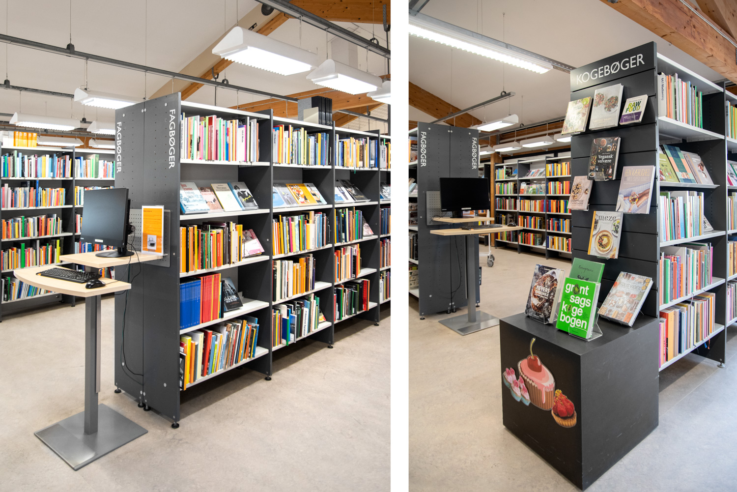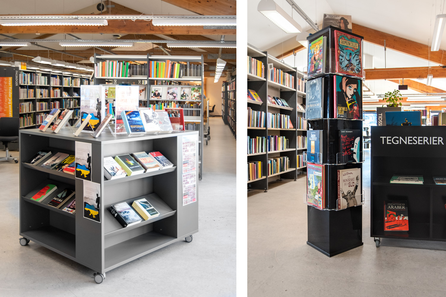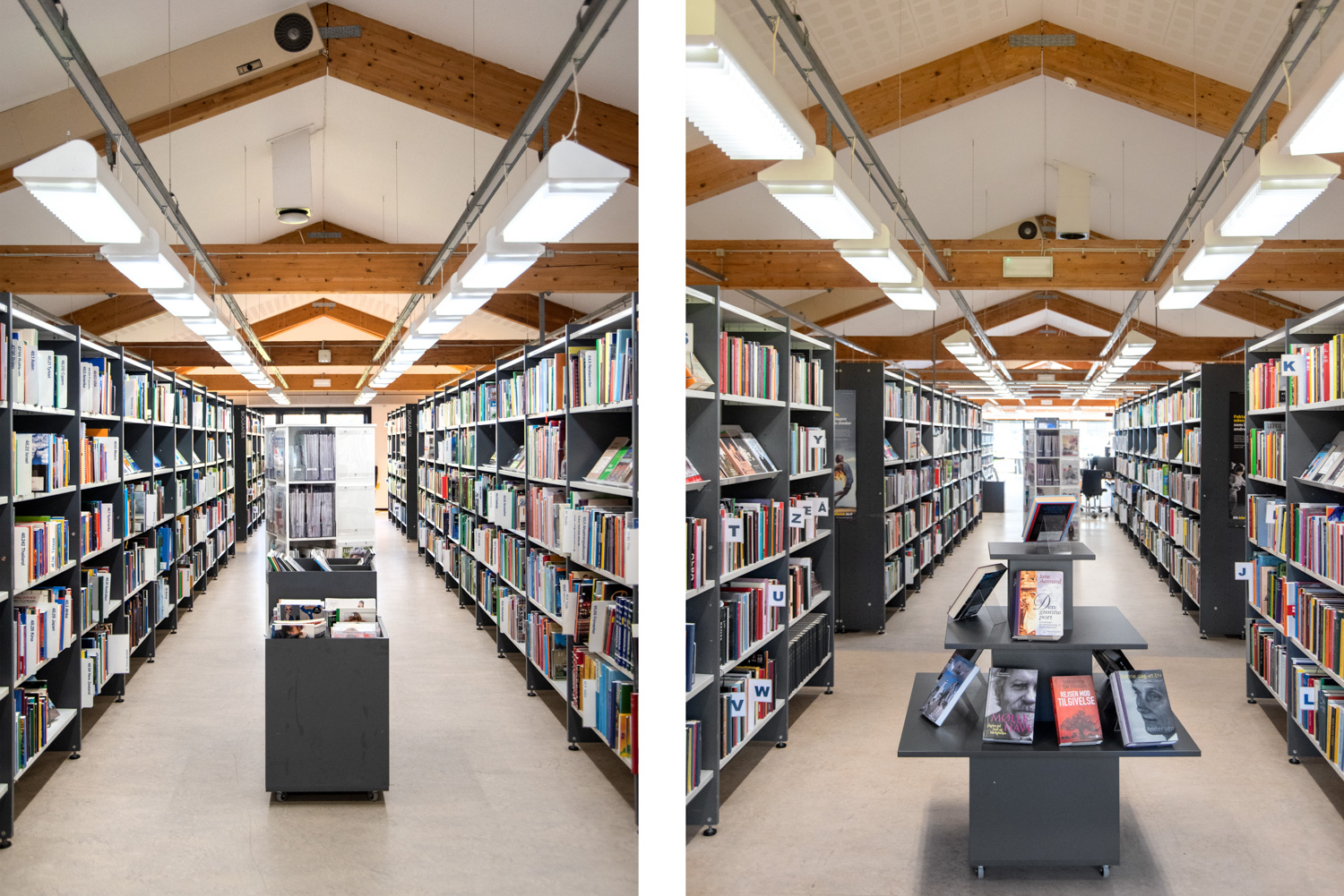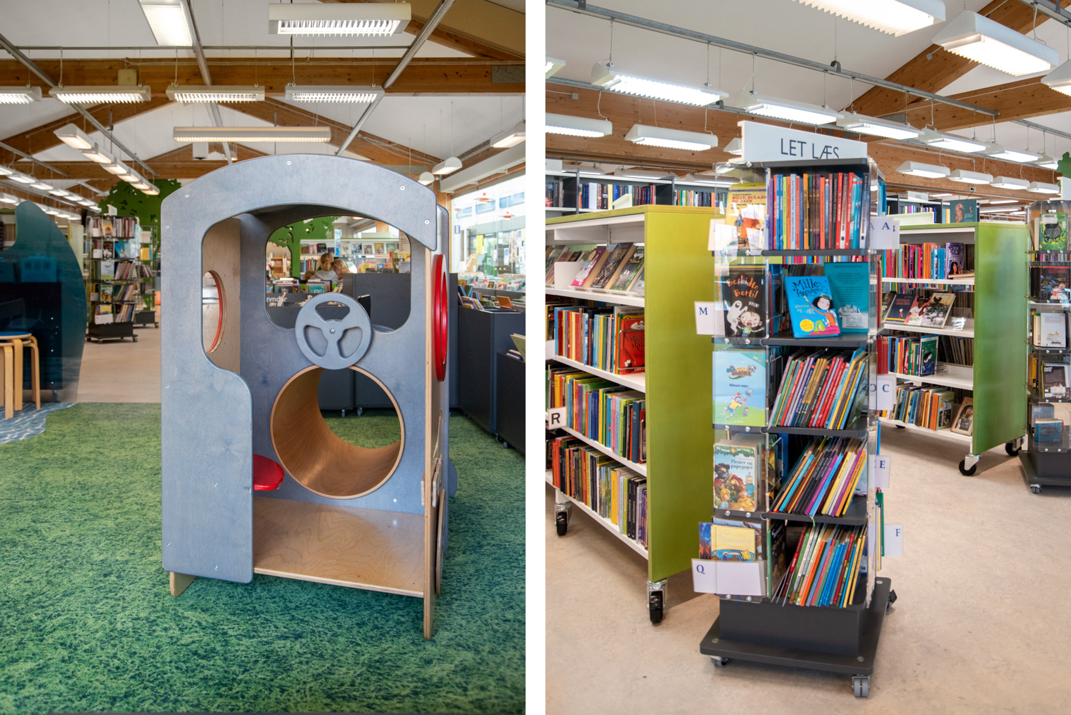 Before the renovation, the children’s department was dominated by tall shelving systems containing books for children of all ages, all mixed together. After the renovation, lower shelving systems have replaced the taller ones, creating a room within the room, books for different target groups have been separated, and custom-made library furniture focuses on play, nature, and fantasy.