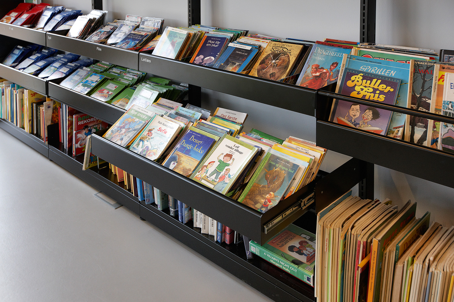 The library is furnished with the Classic Steel Shelving System, London end panel and canopy, and built-in Book Big Lighting. There are also special-made solutions like the integrated tables at the ends of the shelving and the round picture book browsers in the children’s area.