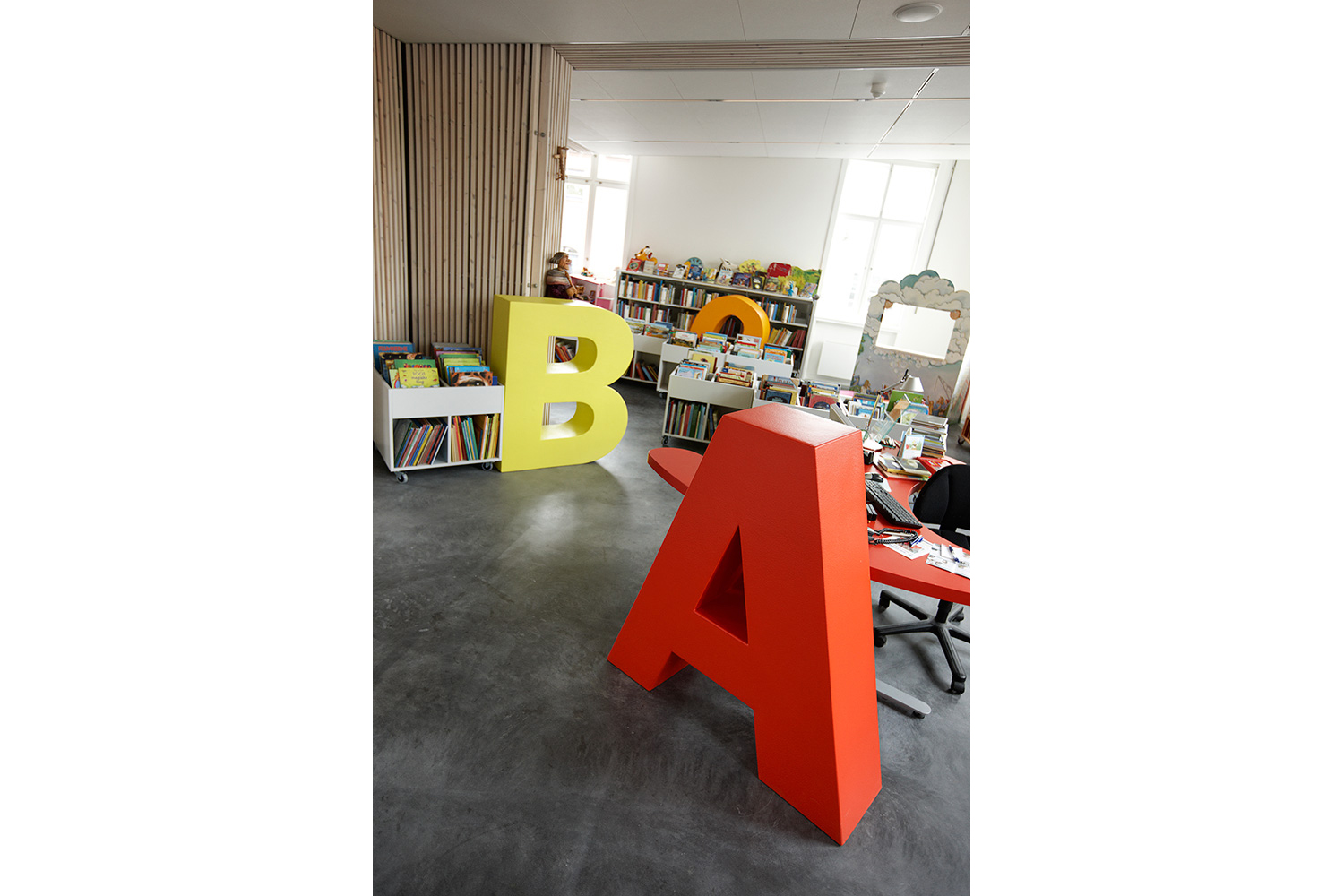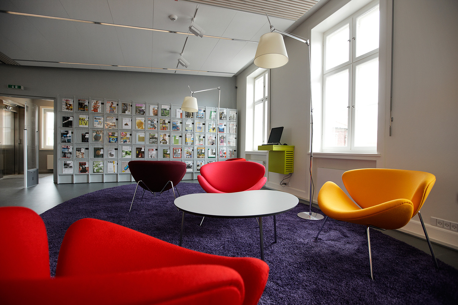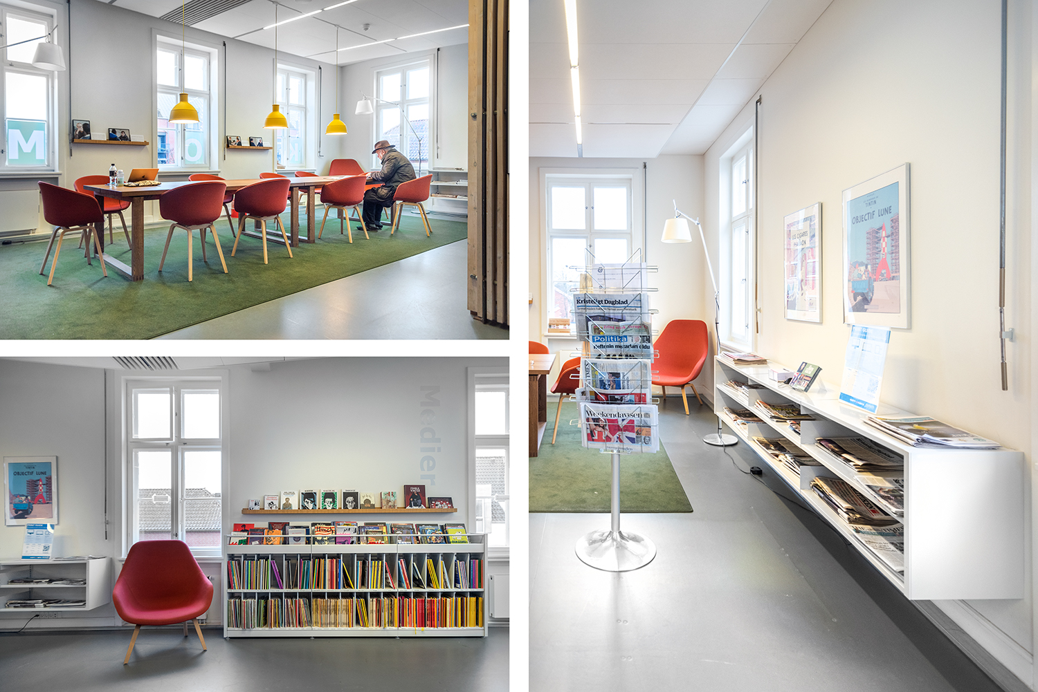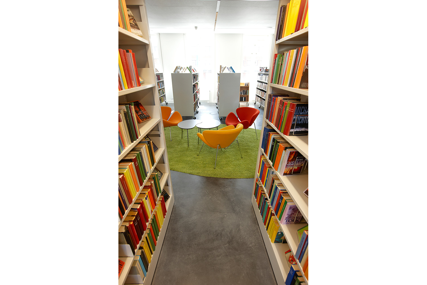 The functional Classic Steel Shelving System is combined with special made counters and information desks from PO Inventar. Details like the rya rugs, soft chairs and big foam letters are also worth a notice.