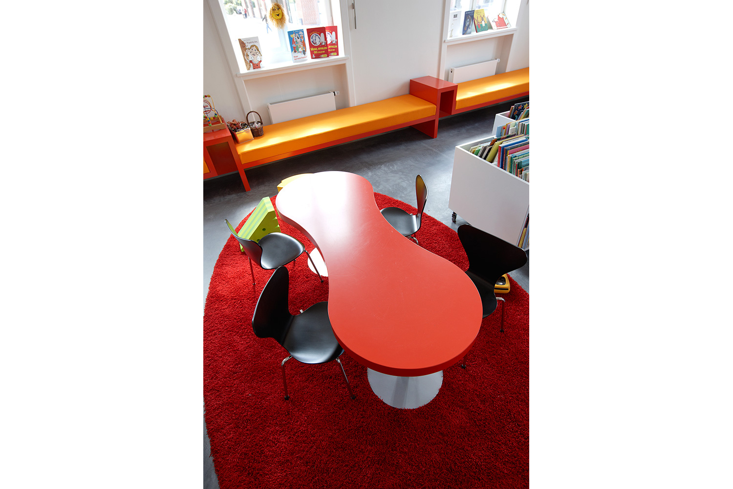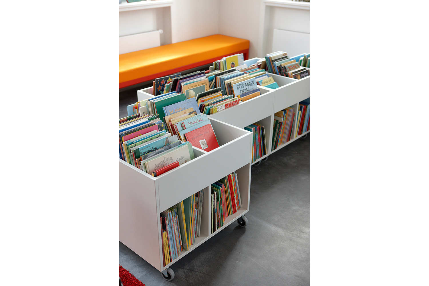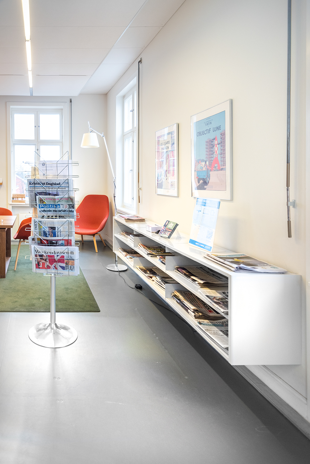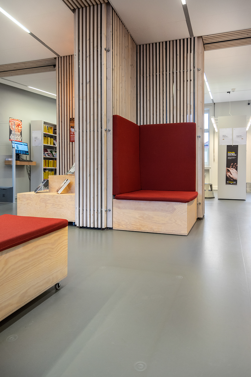 The functional Classic Steel Shelving System is combined with special made counters and information desks from PO Inventar. Details like the rya rugs, soft chairs and big foam letters are also worth a notice.