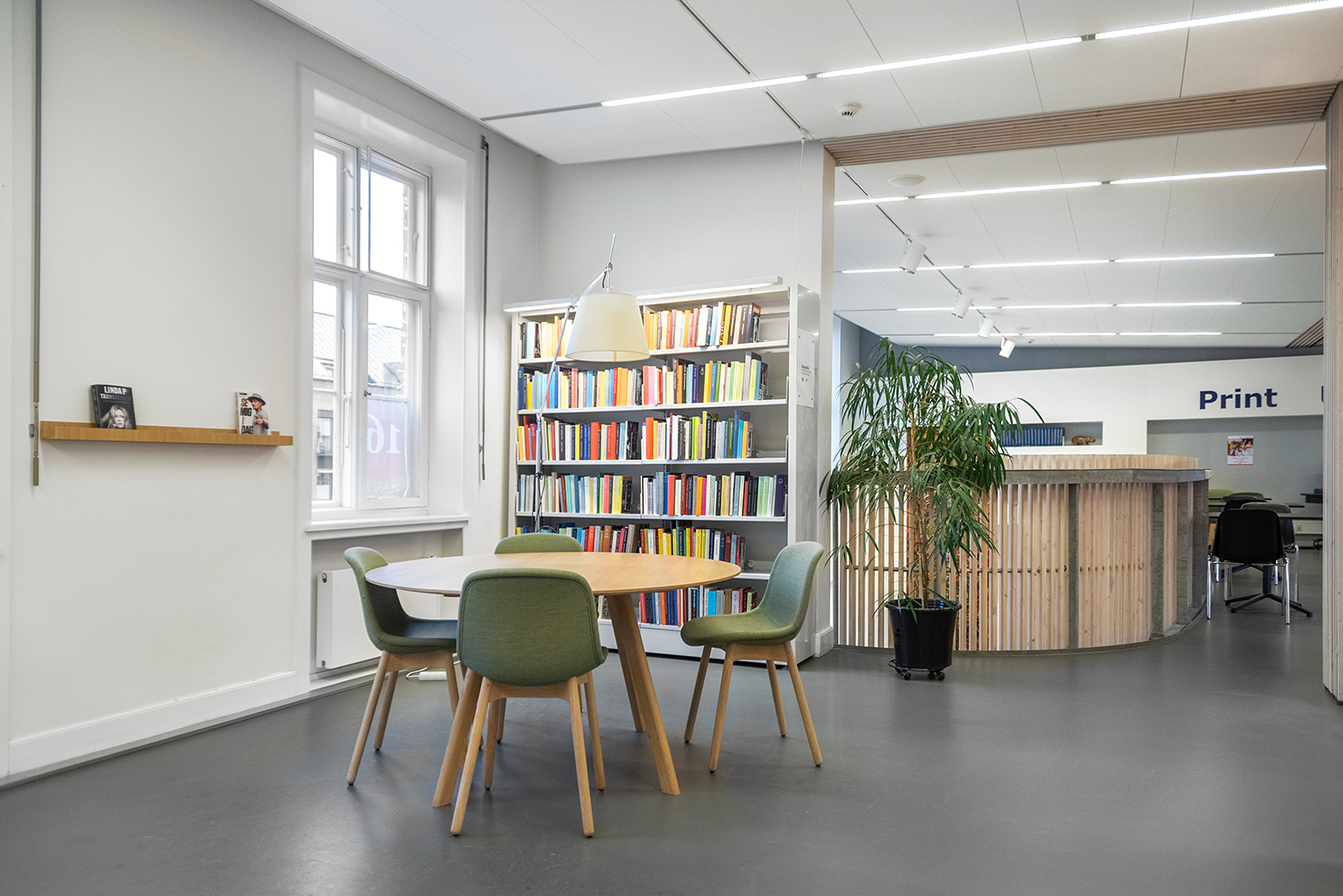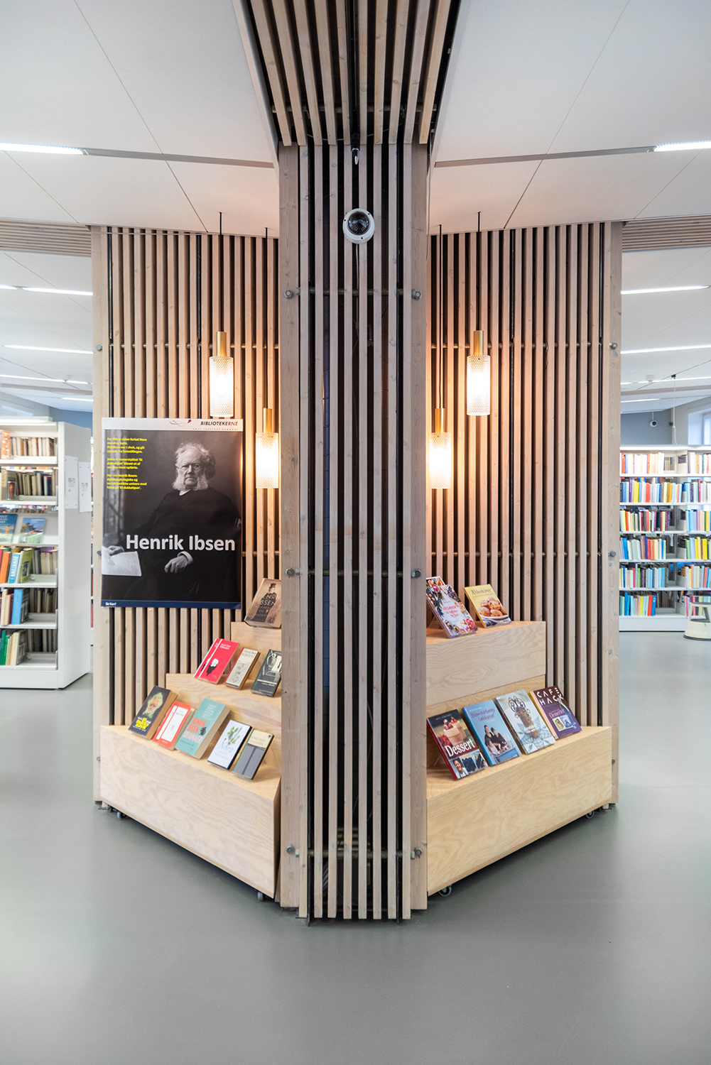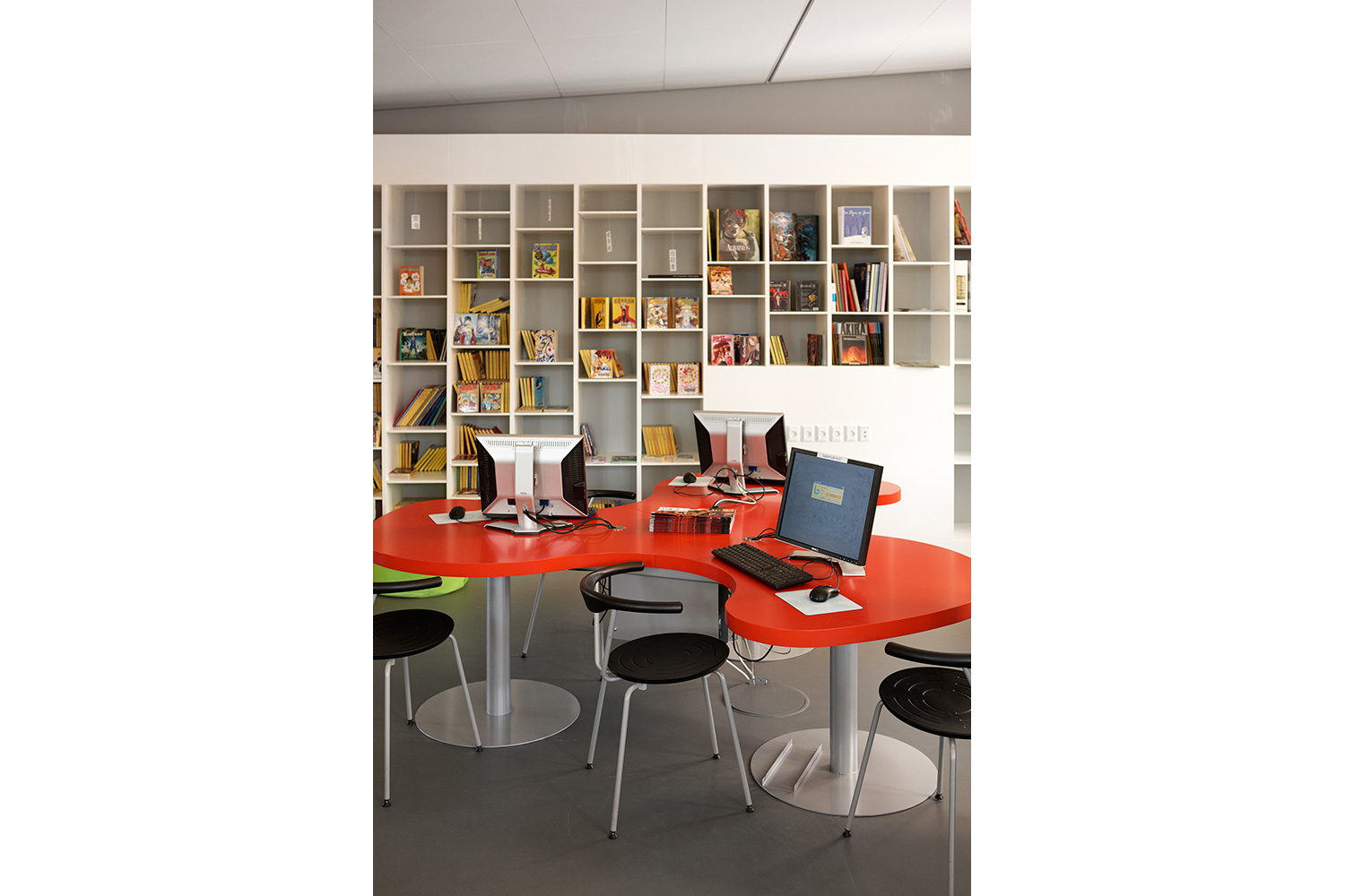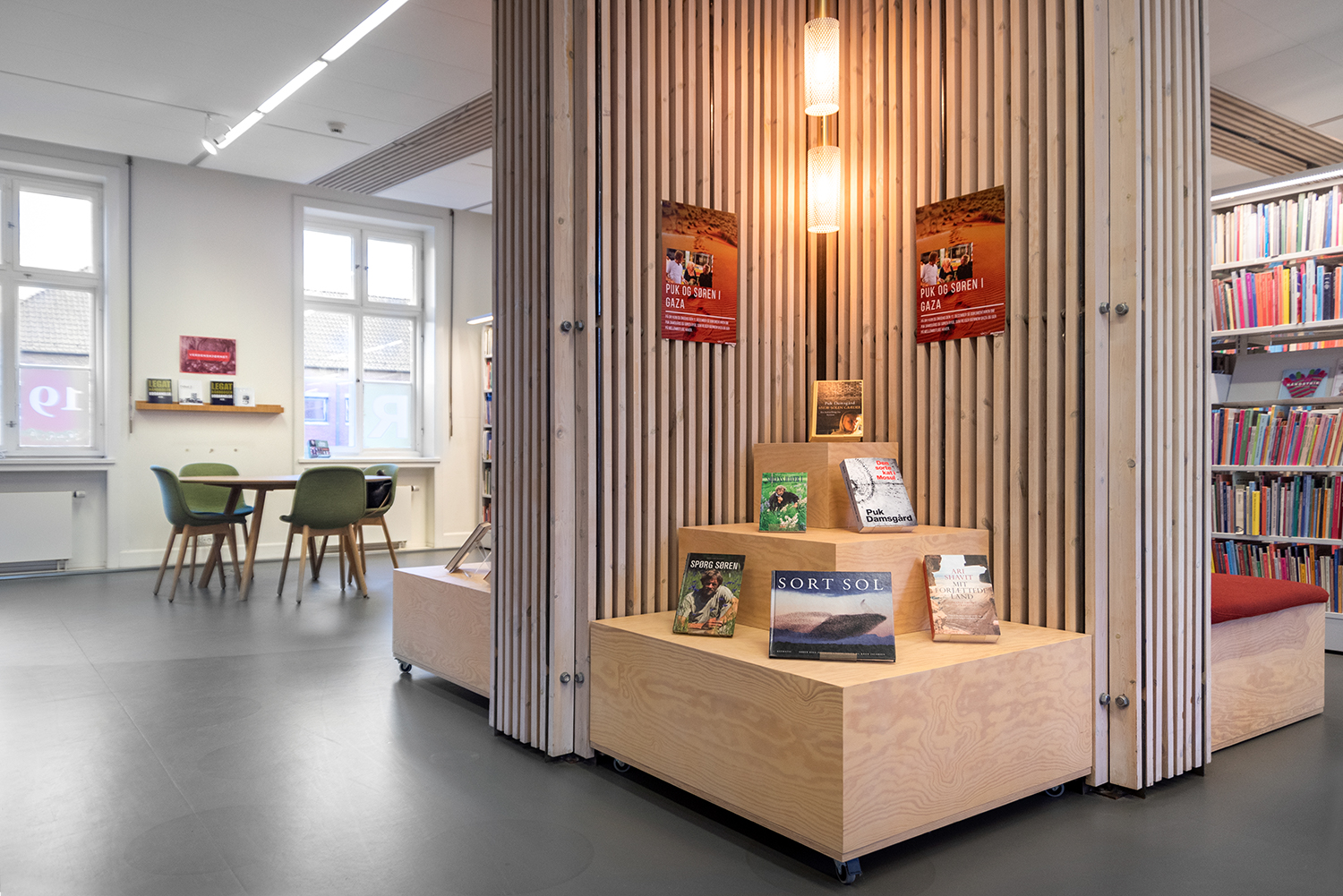The functional Classic Steel Shelving System is combined with special made counters and information desks from PO Inventar. Details like the rya rugs, soft chairs and big foam letters are also worth a notice.