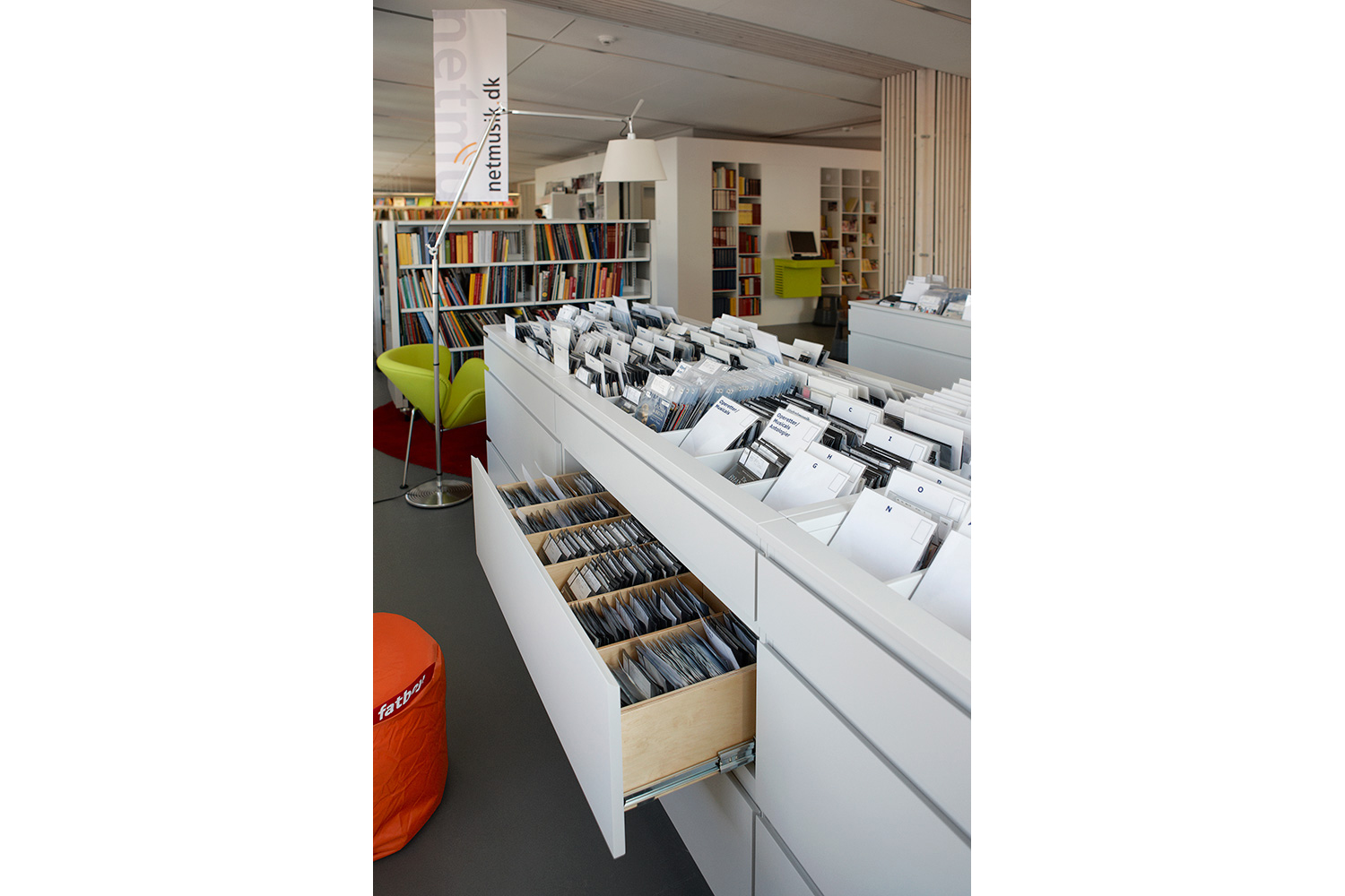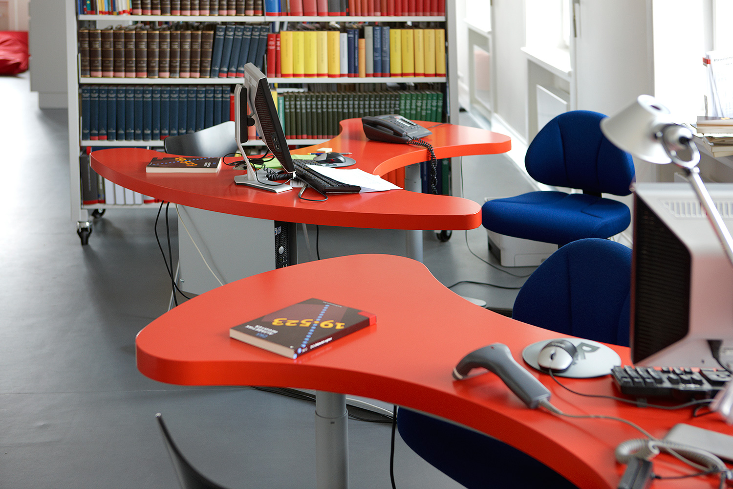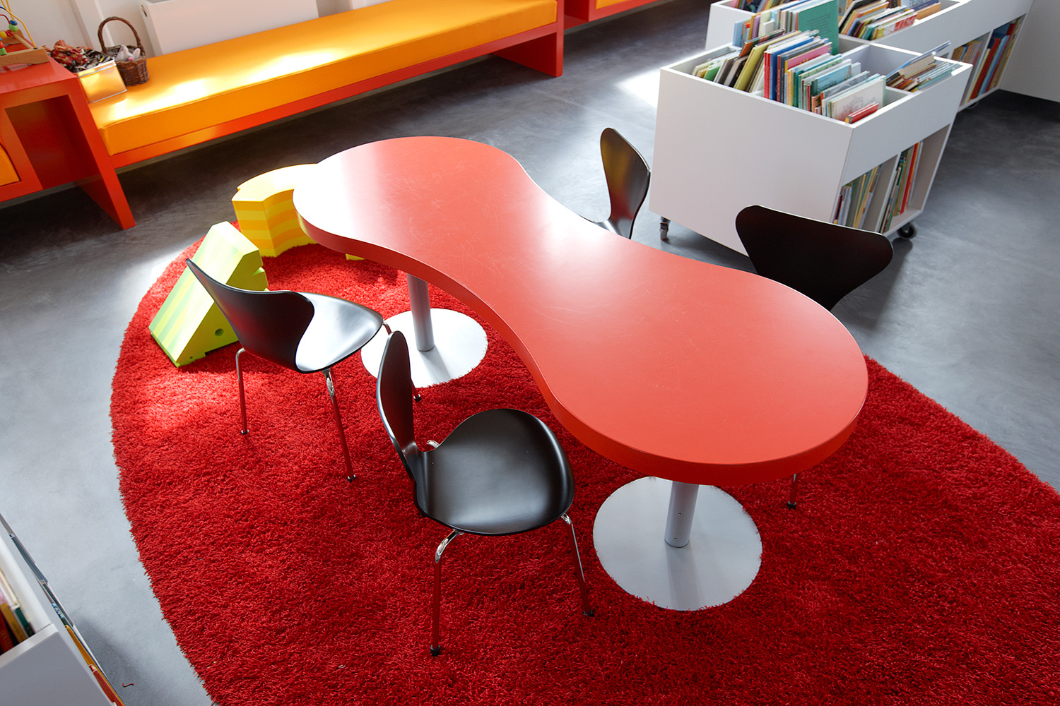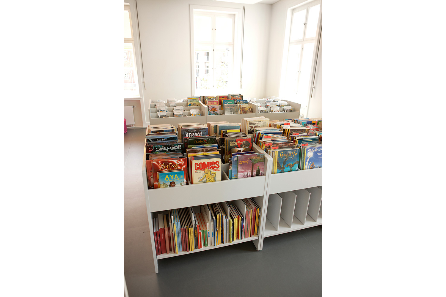The functional Classic Steel Shelving System is combined with special made counters and information desks from PO Inventar. Details like the rya rugs, soft chairs and big foam letters are also worth a notice.