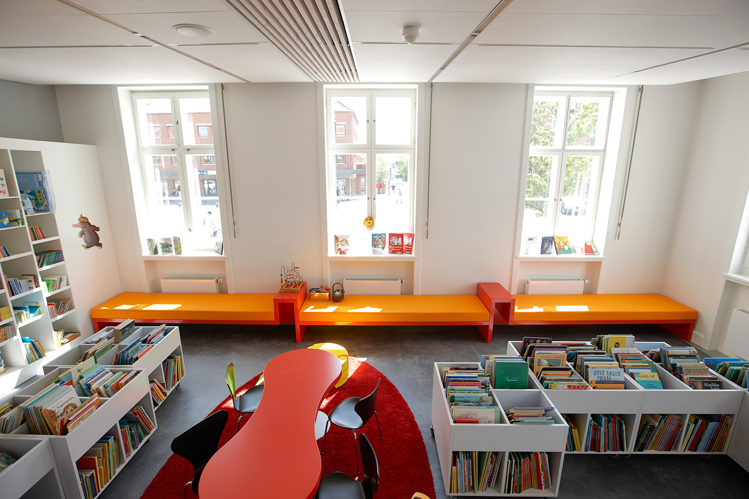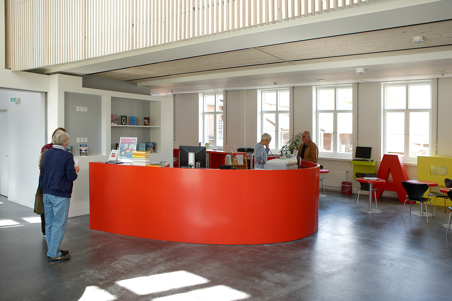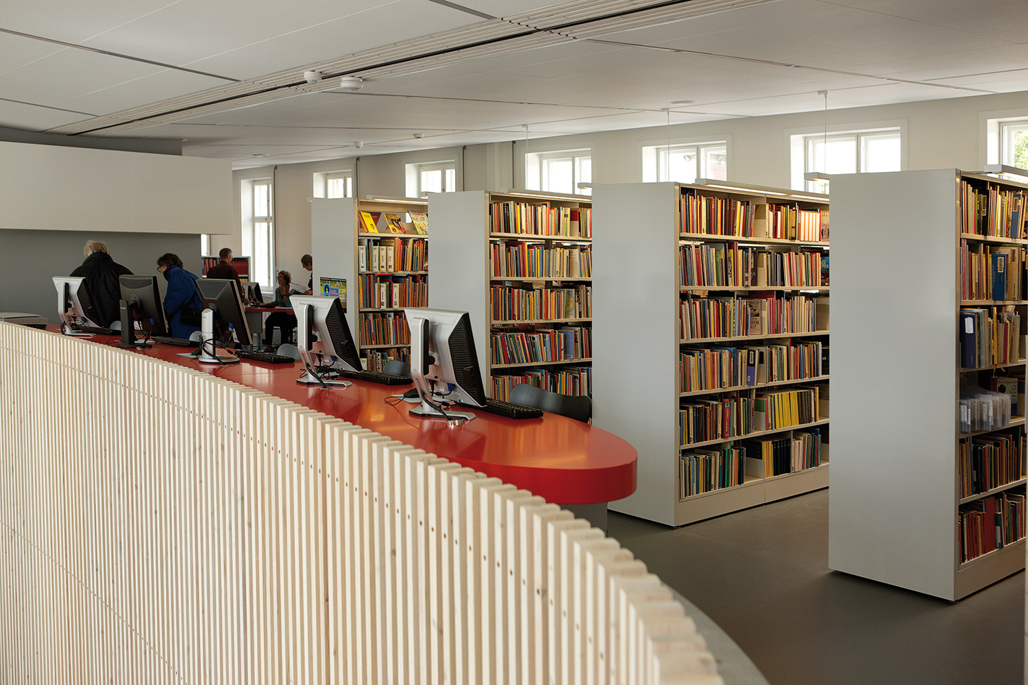 The architecture meets the demands of a modern library where access to e-books is as important as the traditional books. Mobility, flexibility and interaction has been the leading motivation for the project. The result is an inspiring library that brings new life to the town hall.