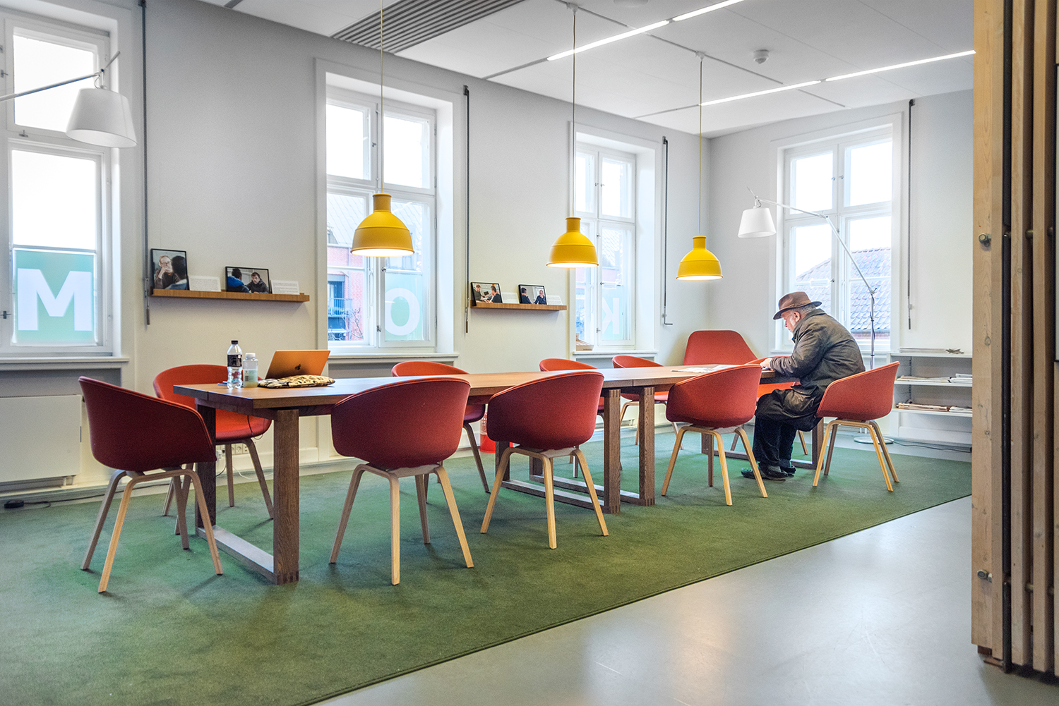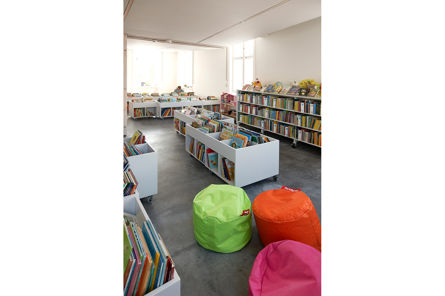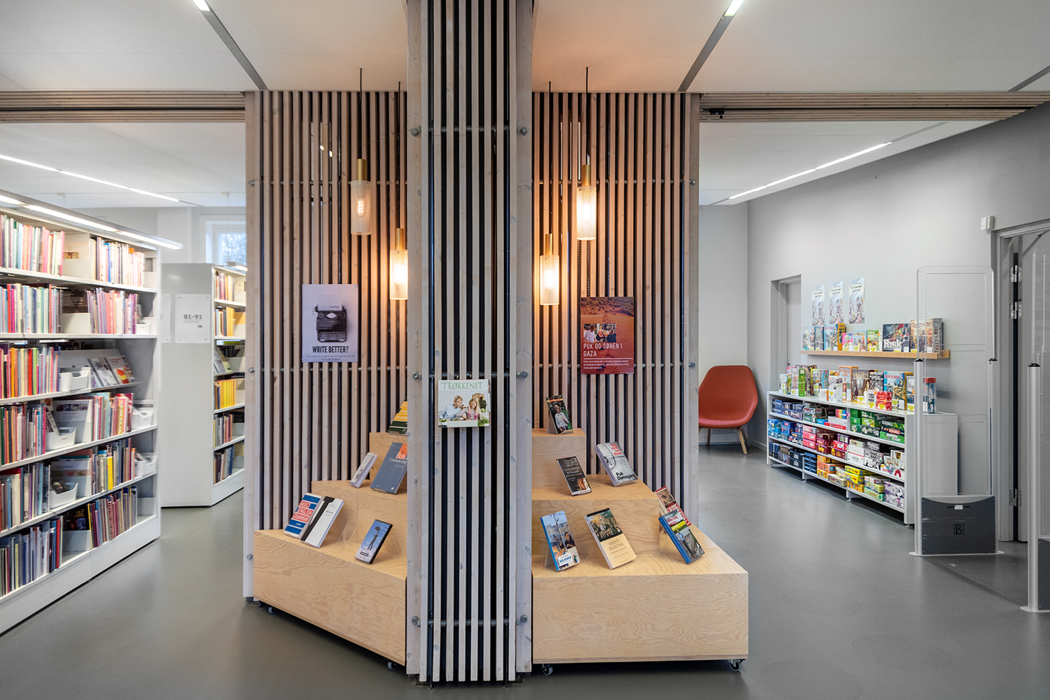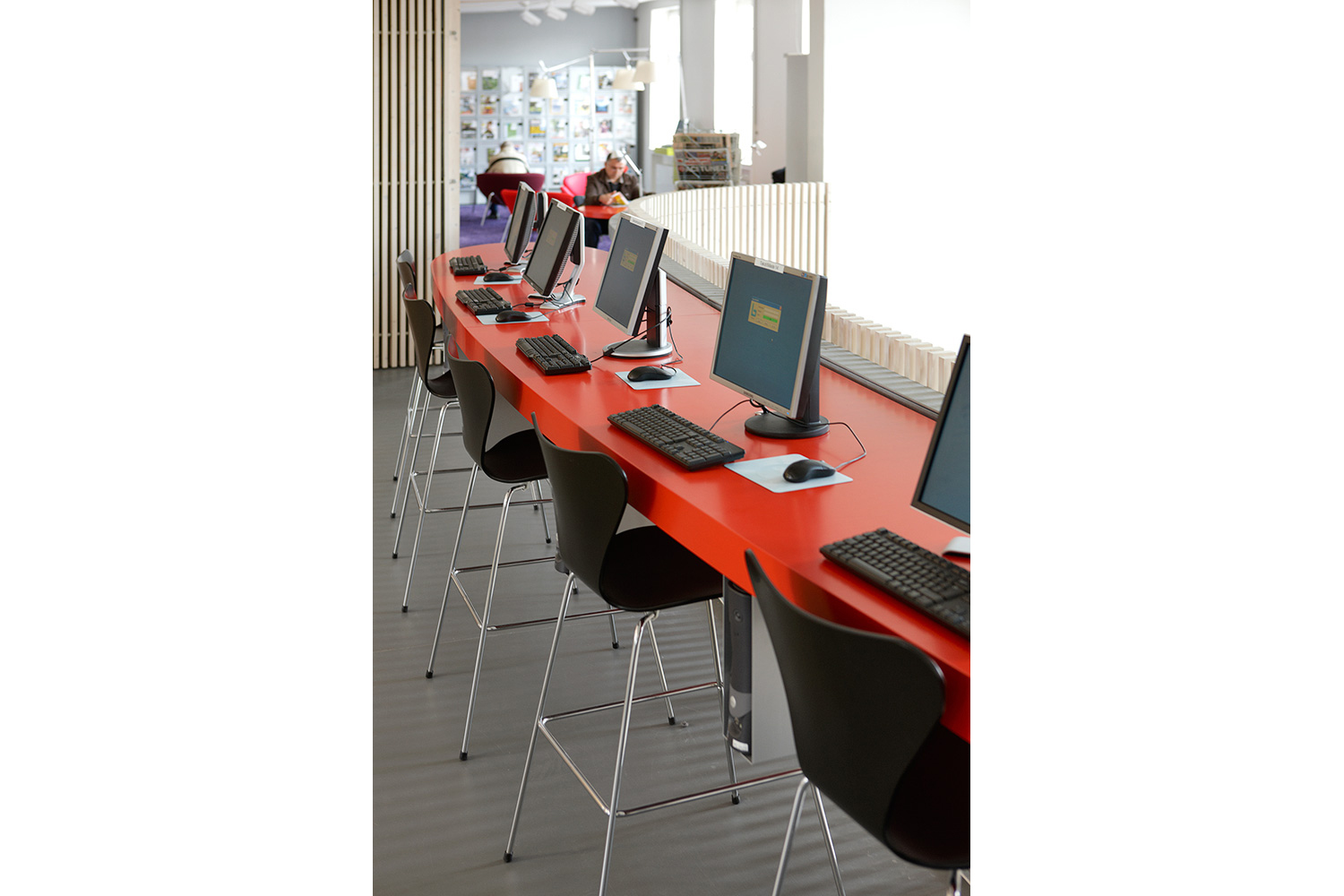 The architecture meets the demands of a modern library where access to e-books is as important as the traditional books. Mobility, flexibility and interaction has been the leading motivation for the project. The result is an inspiring library that brings new life to the town hall.