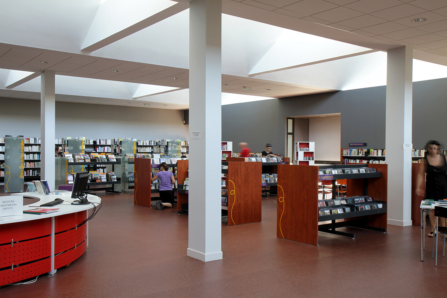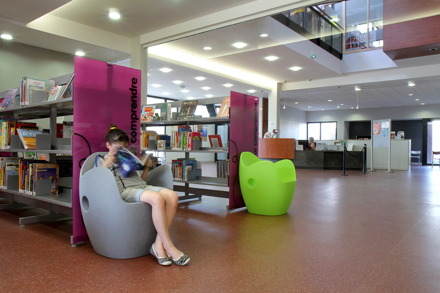 With its dedicated areas for multimedia and the toy library, La Filoche media library has a two-level structure. The interior design combines wood with industrial materials. The play areas for children are bright and awash with colour, and the rest of the library is transparent, light and airy. The Classic Steel Shelving System has been enhanced with multi-coloured acrylic end panels.