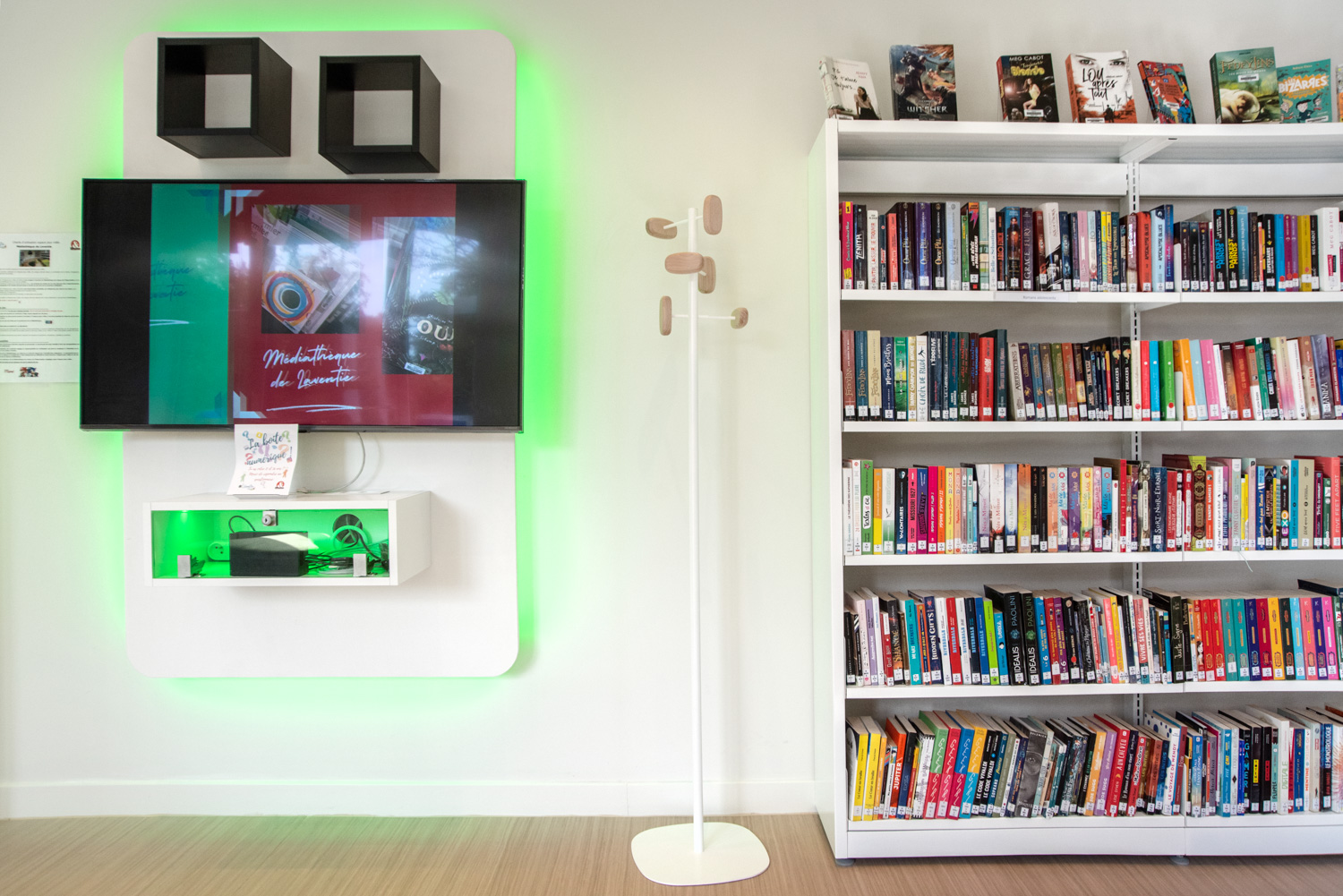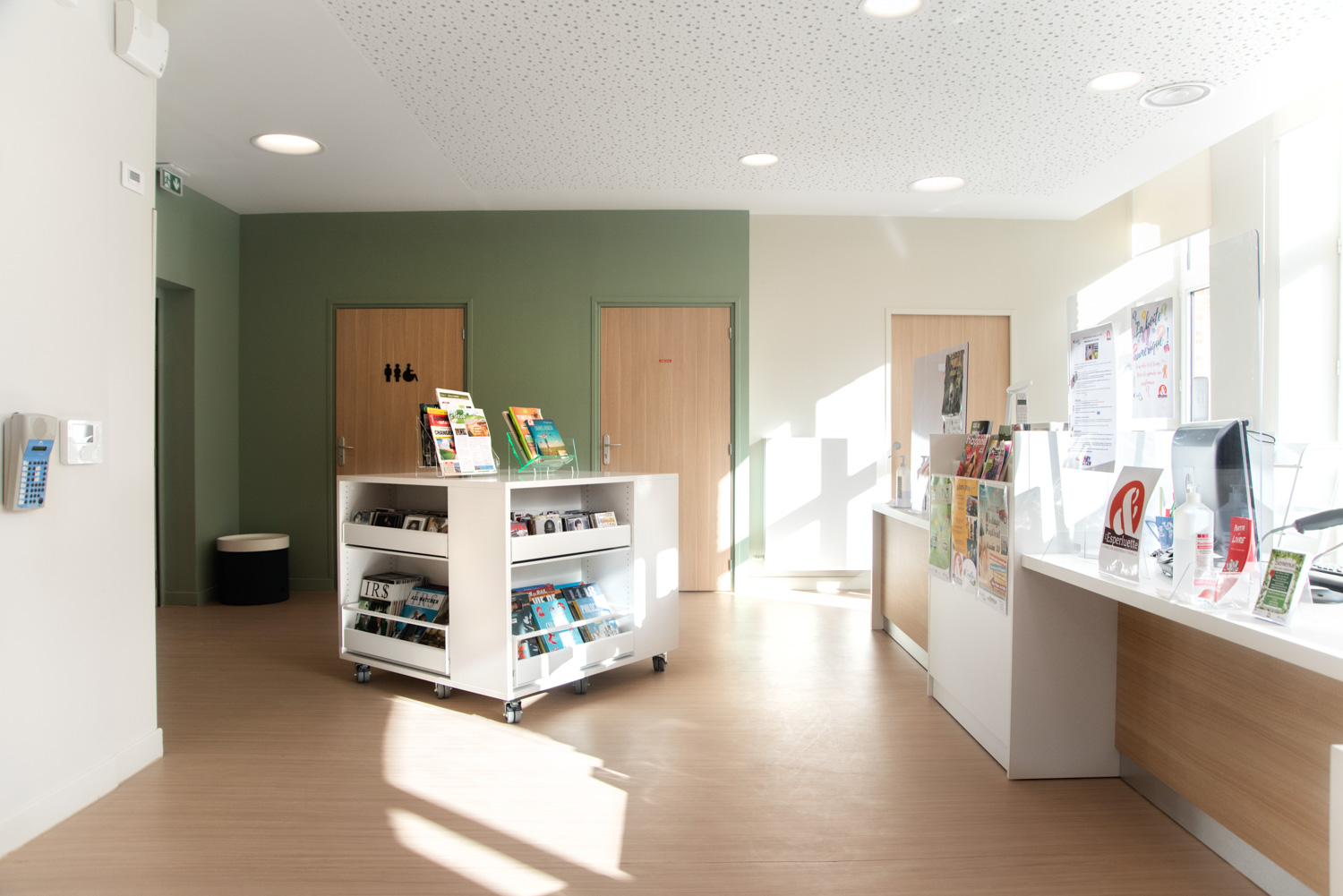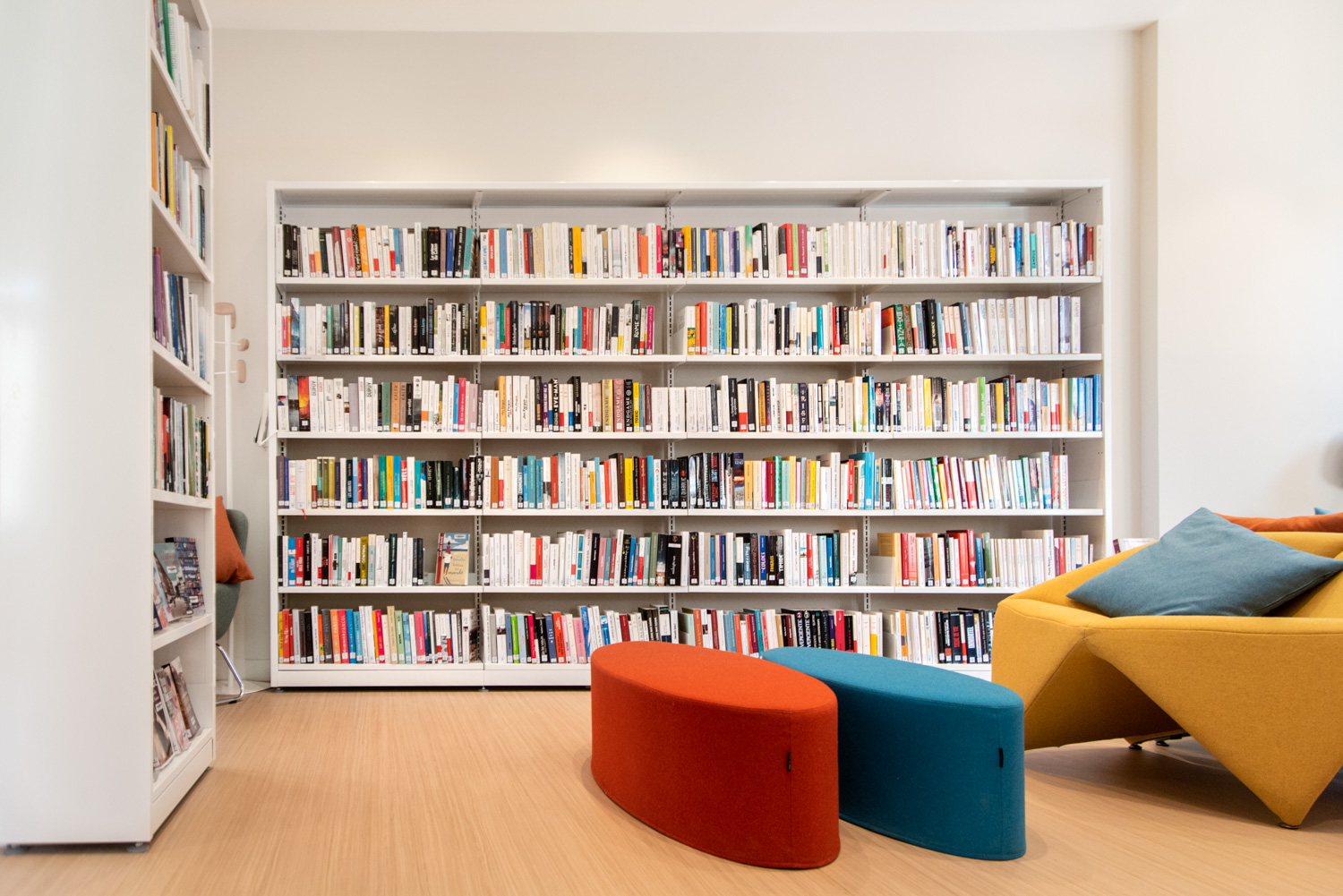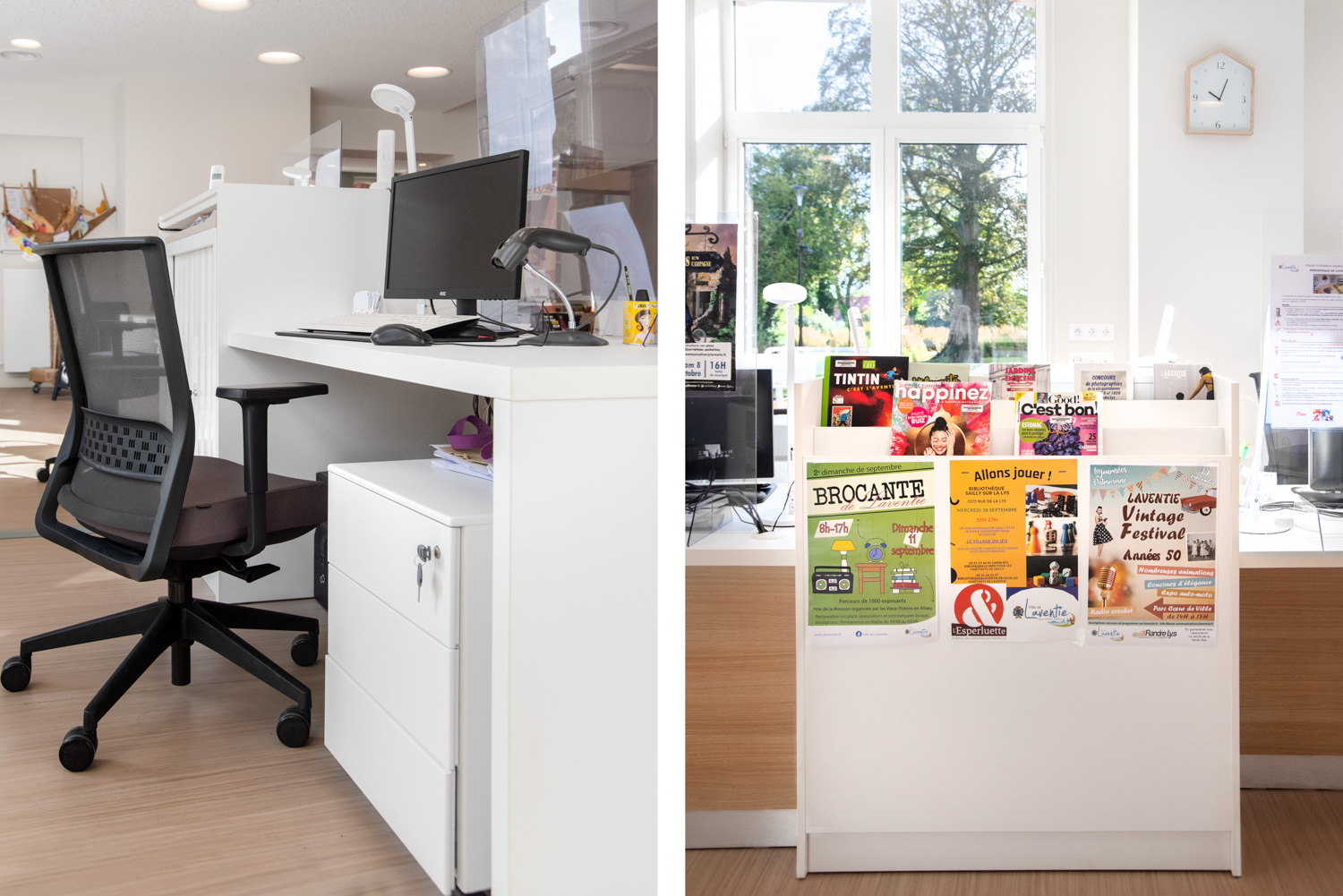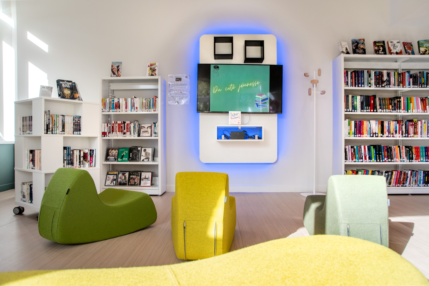 The Lavent'ure library is located on the ground floor of the Castel de l'Allœu near the town centre. The restoration of this building, which preserves period features such as the fireplace and painted decor, gives readers the feeling of being at home. The shelving and furnishings provide visual comfort that is much appreciated by users. The choice of furnishings and colours enhances this new installation.