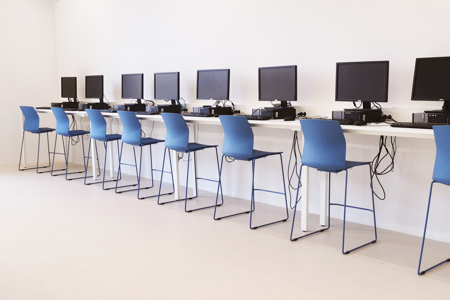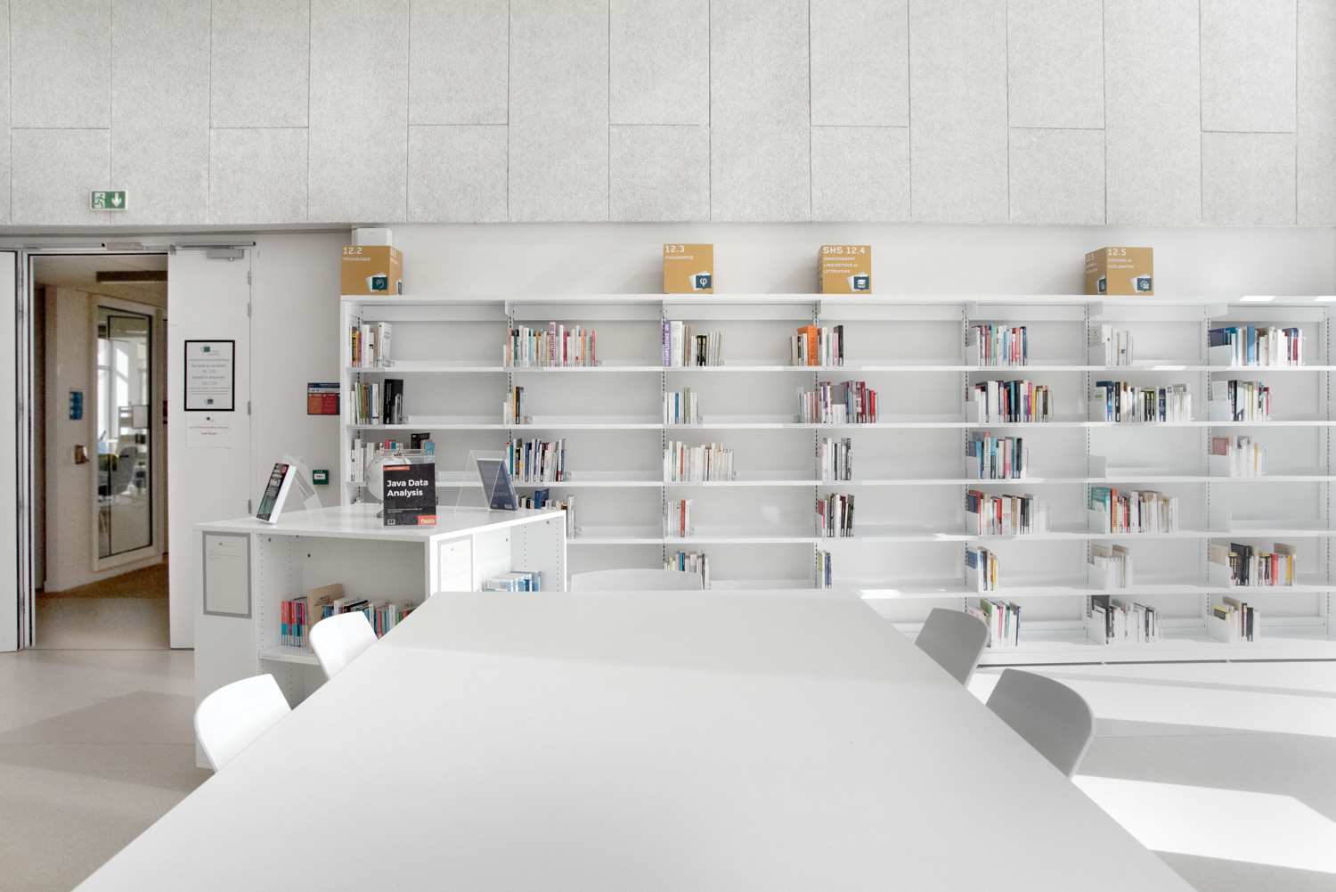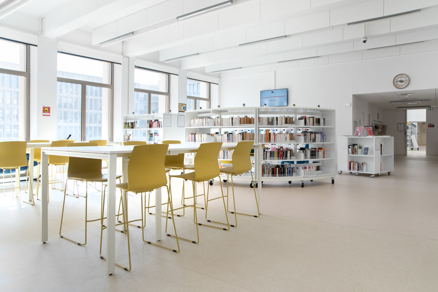 Located in the centre of the school and with an area of approximately 800 m2, the library has been completely refurbished with new furniture. It consists of three large areas: a work room, a room consisting of books and a room for relaxation as well as 11 collaborative work rooms. An adjoining cafeteria houses a Cocoon in which librarians can offer books and newspapers as donations.
